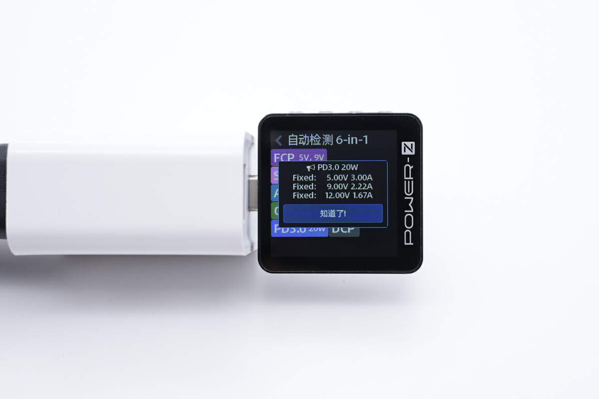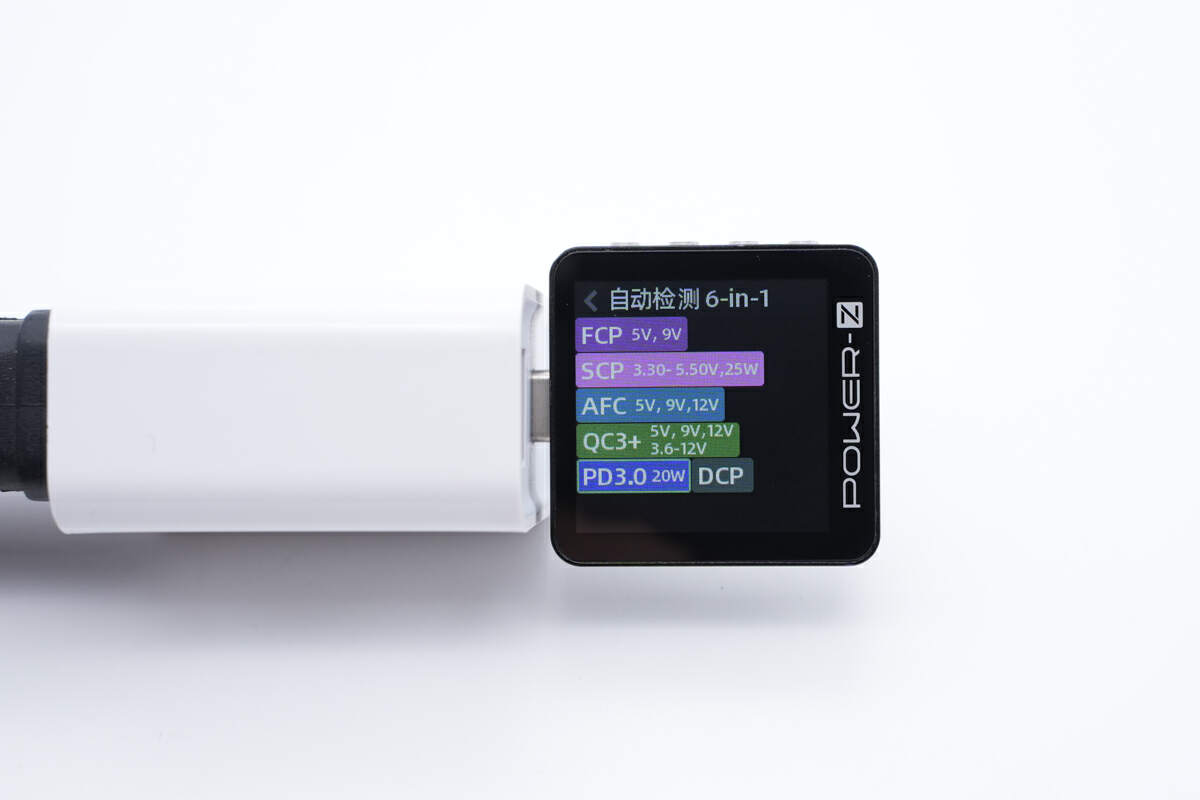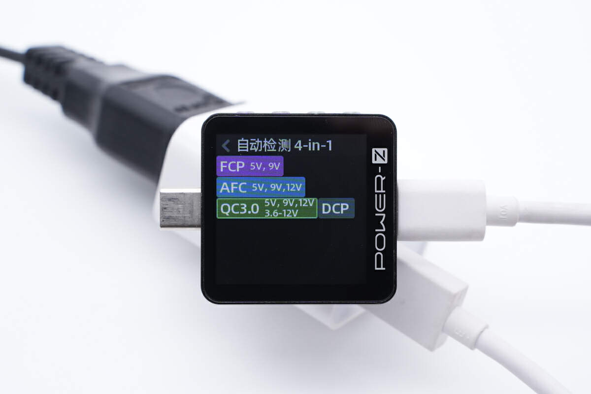 使用ChargerLAB POWER-Z KM003C测得充电器支持FCP、SCP、AFC、QC3+、PD3.0、DCP充电协议。