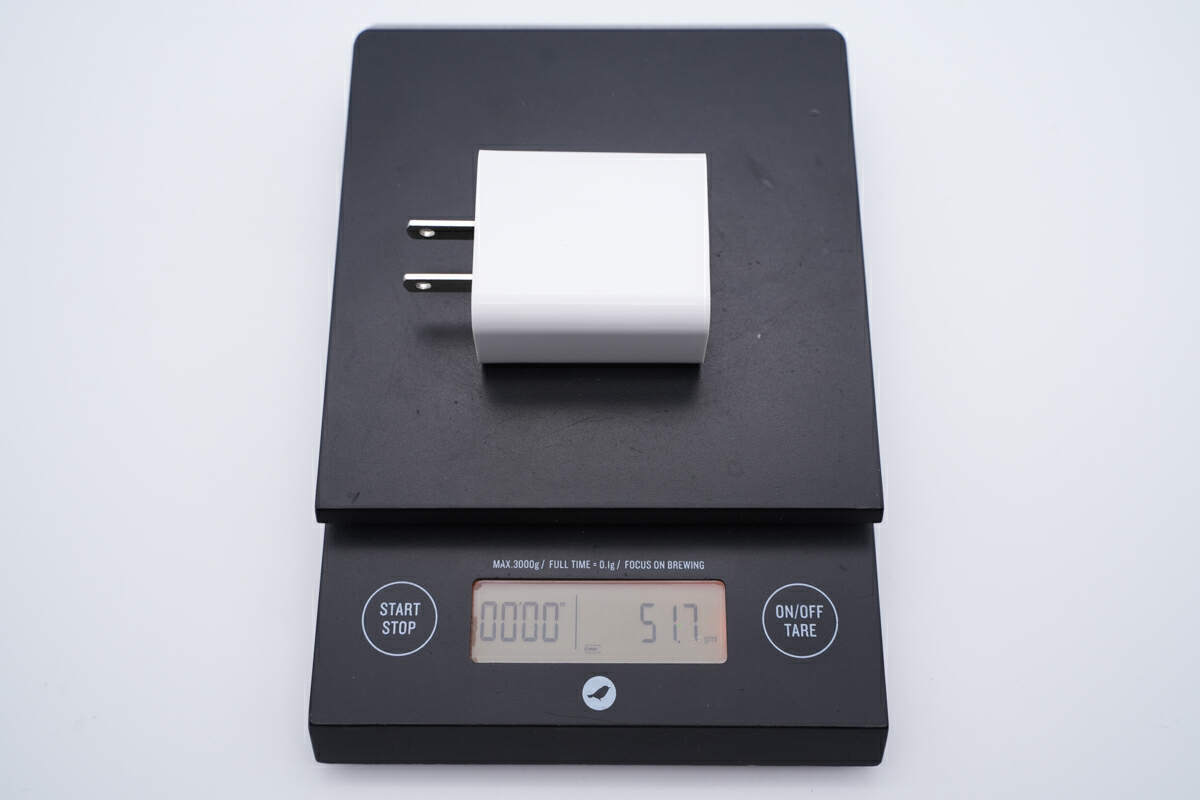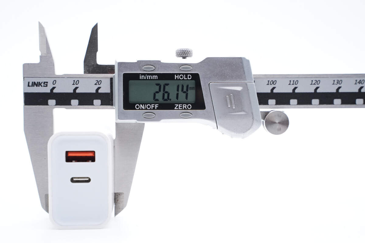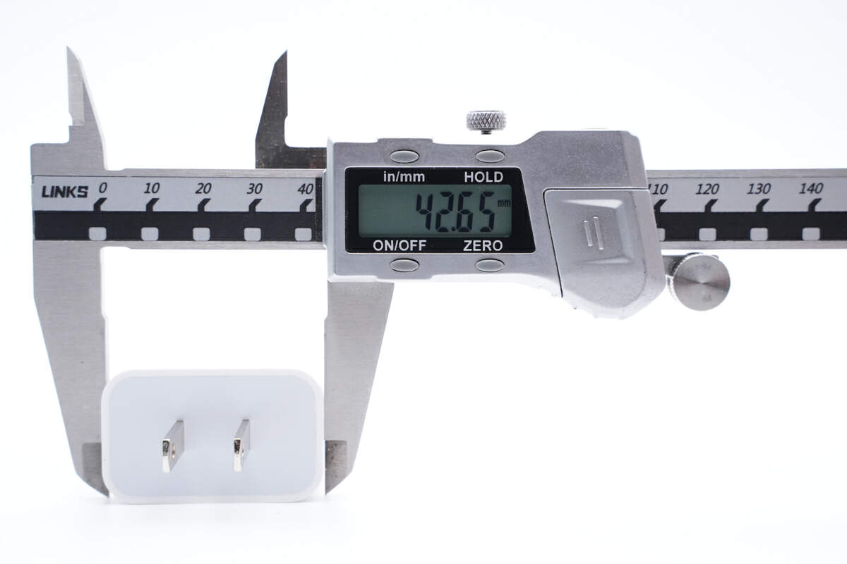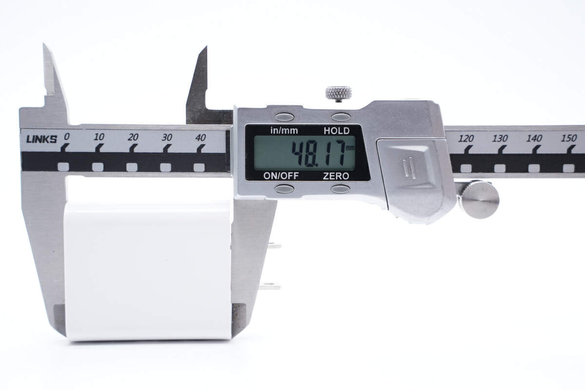 和苹果20W充电器对比,两者宽度相当,华湳通这款机身稍长一点。