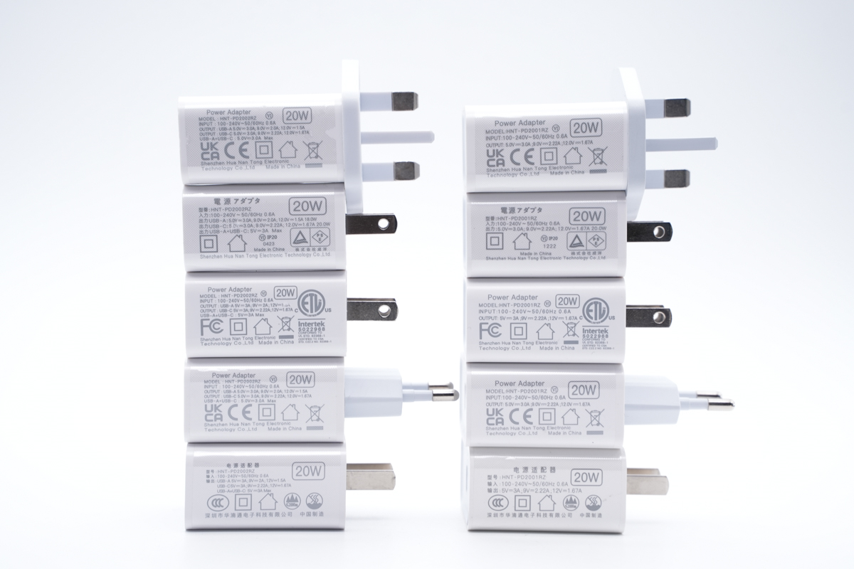 深圳市华湳通电子科技有限公司于2013年成立,主要产品为电源适配器,手机充电器和数据线等,集研发、生产和销售于一身。充电头网拿到了华湳通电子推出的20W充电器,根据插脚不同和输出接口不同,共分为十个款式。