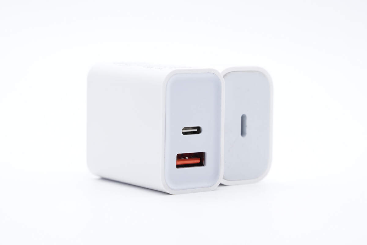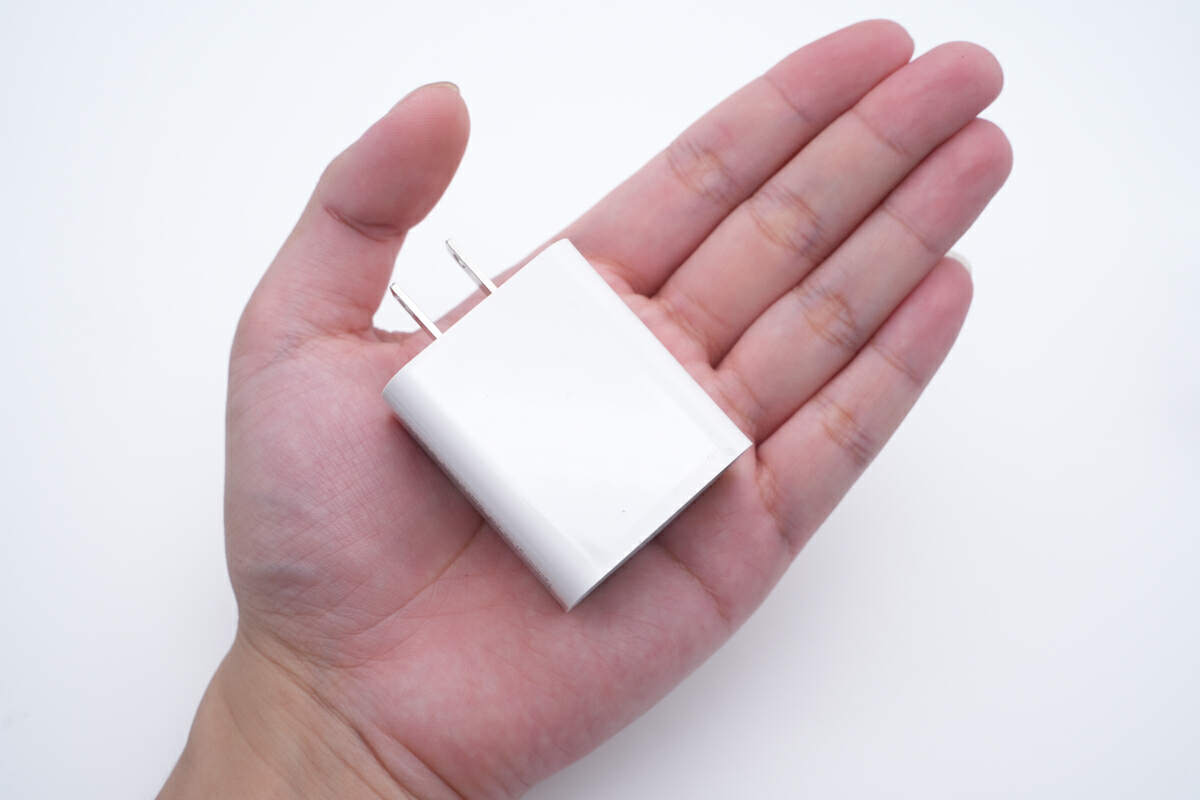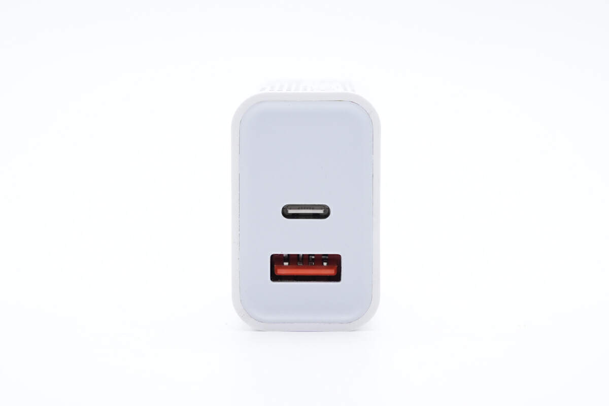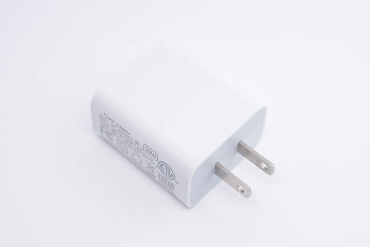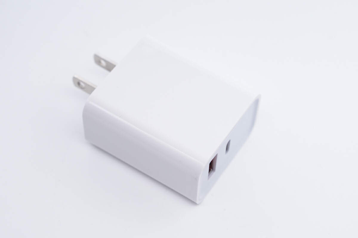 华湳通20W充电器采用经典直板造型,腰身白色外壳高光亮面处理,输入输出端外壳灰色磨砂,配色方面和苹果原装20W充电器的一样。