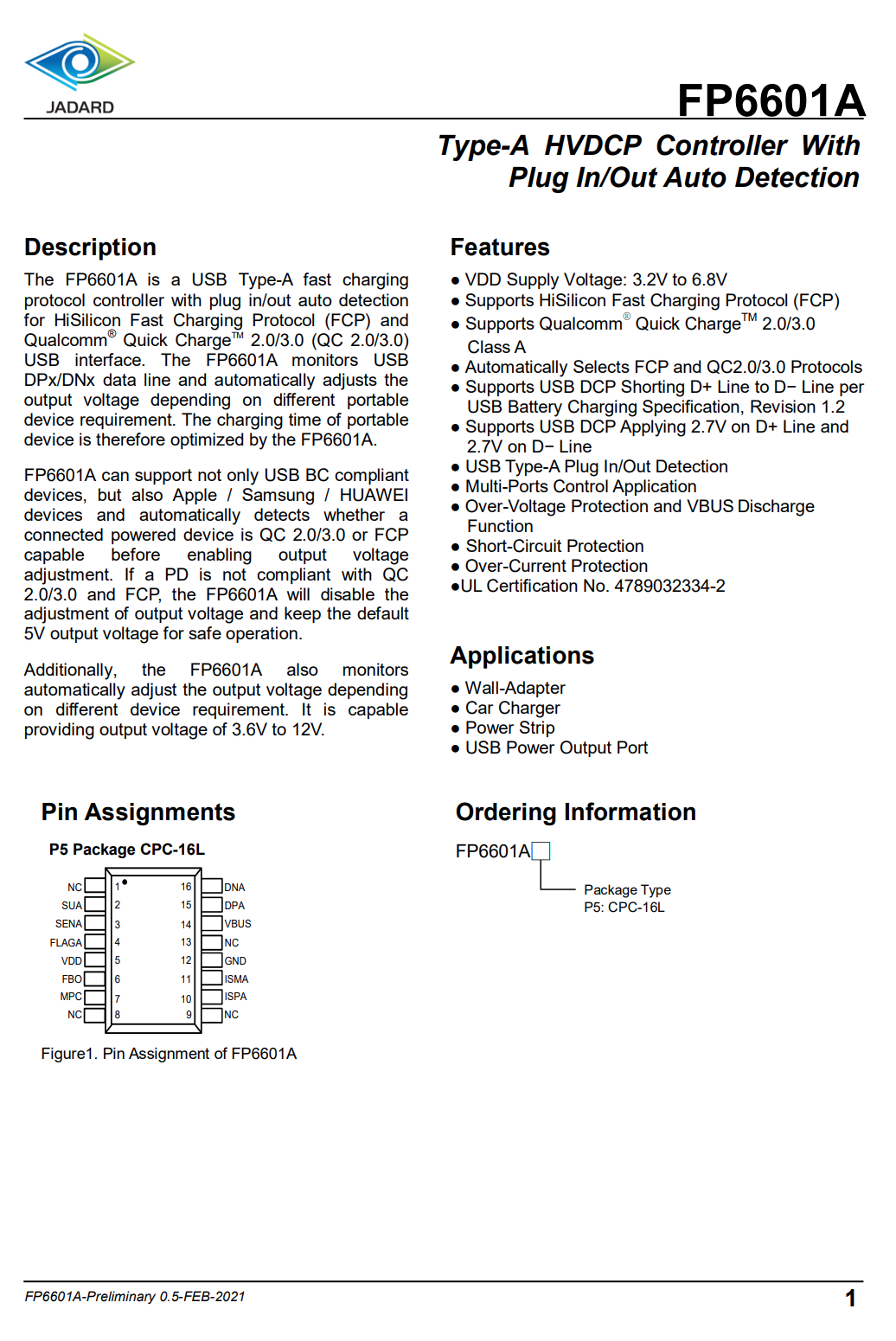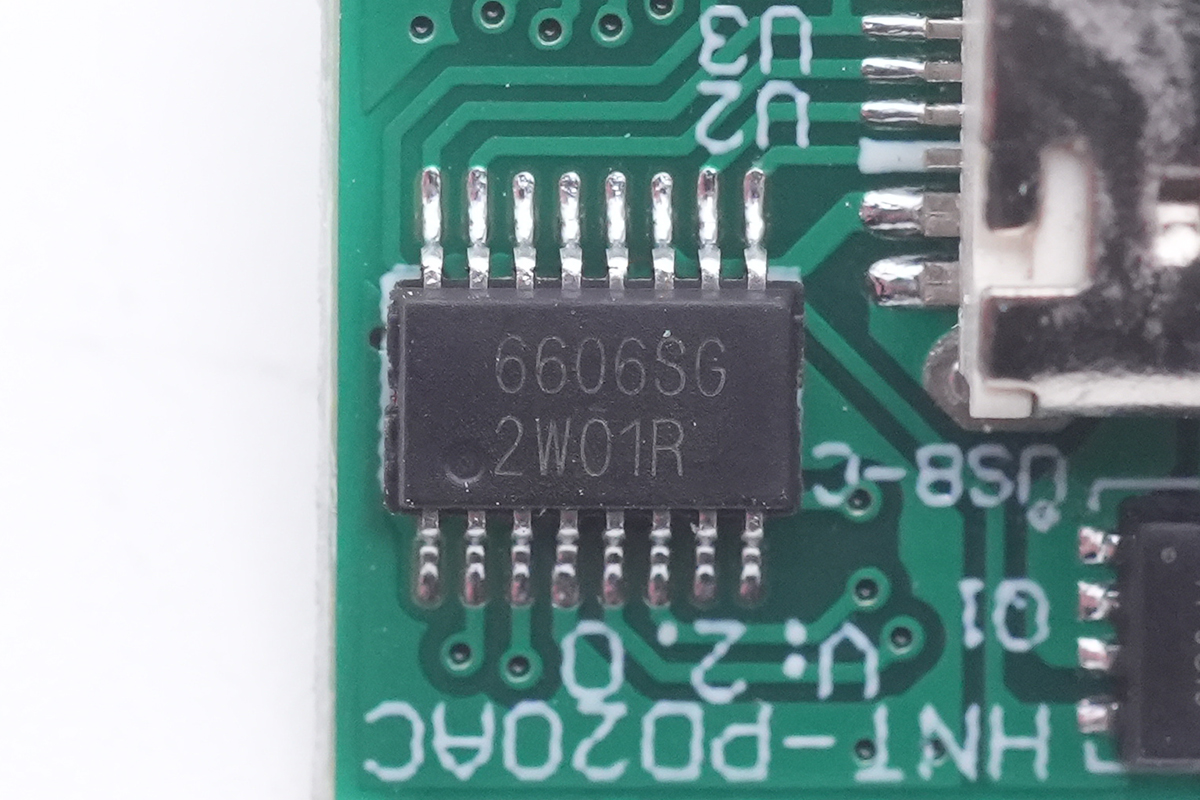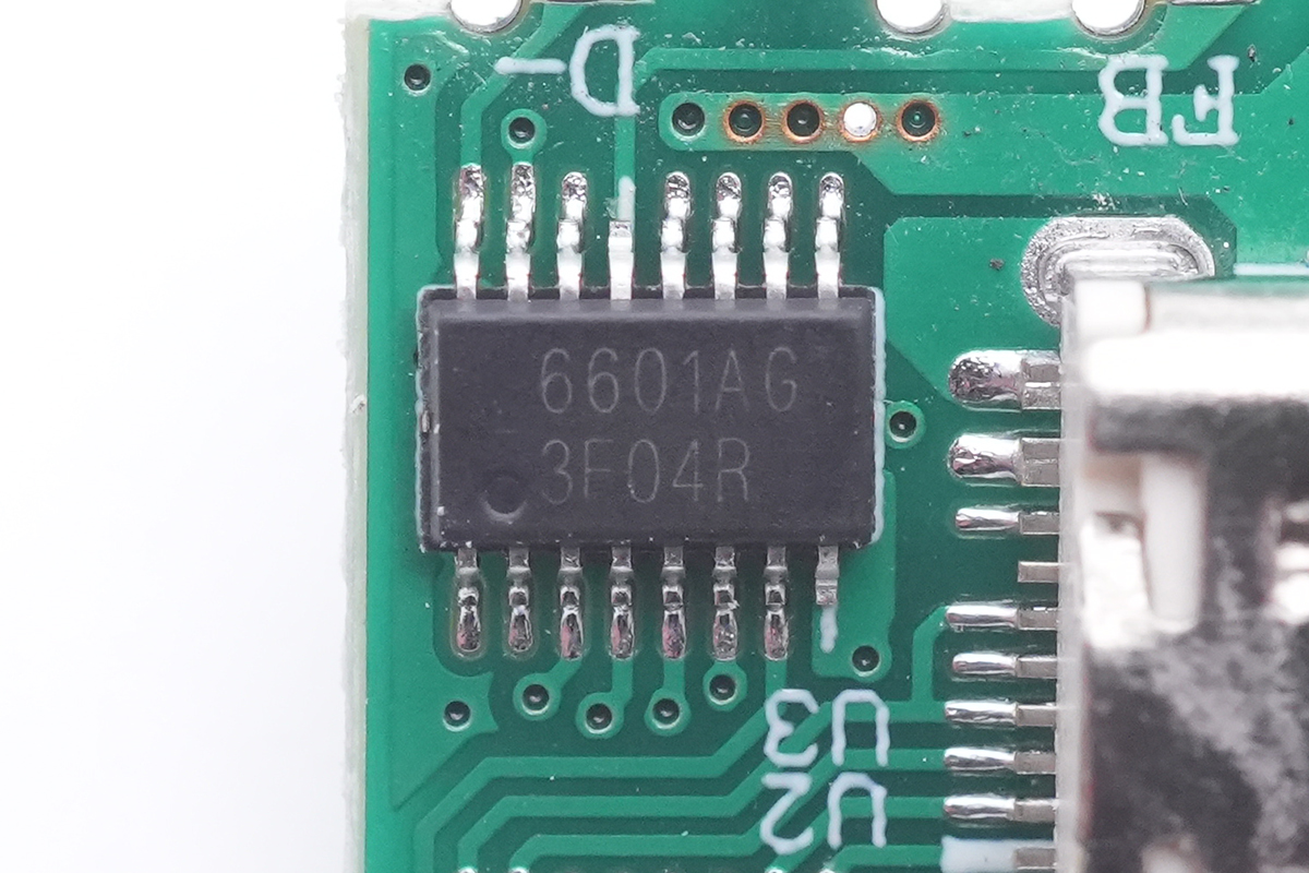 另一颗用于USB-A口的协议芯片同样来自天德钰,型号FP6601A,是一颗支持QC2.0/3.0,华为FCP的快充协议芯片,支持多路协同工作,可实现单口快充和多口5V输出功能。同时具备过电压保护,过电流保护和短路保护功能。