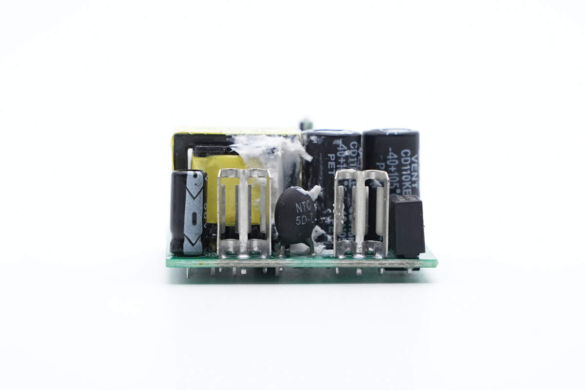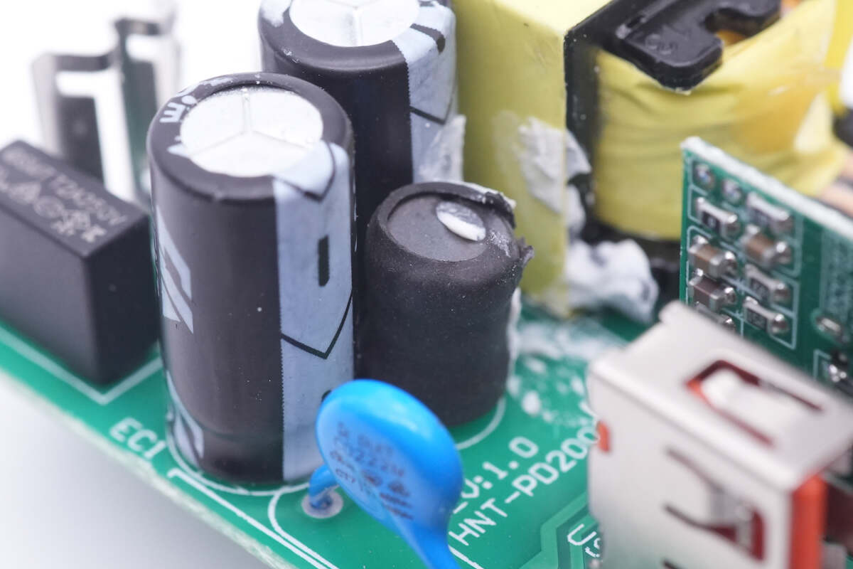 PCBA模块正面一览,底部焊接NTC热敏电阻,保险丝,高压滤波电容和差模电感。左侧焊接变压器,上方焊接滤波电容。USB-C母座焊接在垂直小板上,协议芯片也焊接在同一块小板上。