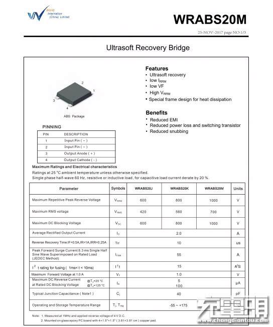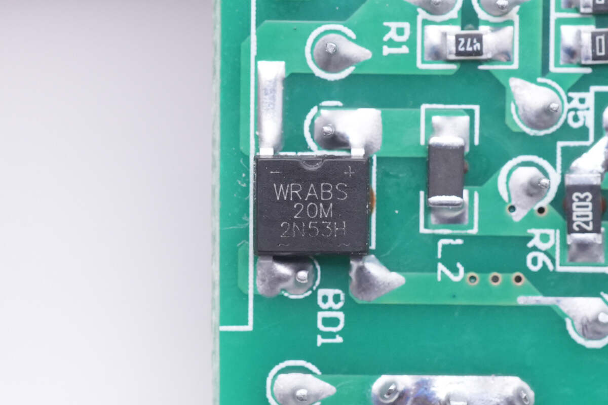 整流桥采用深圳市沃尔德实业有限公司的WRABS20M。这颗软桥通过较软的恢复曲线,比较平滑的关断特性,可以降低二极管结电容达到非常少的谐波振荡产生的效果。