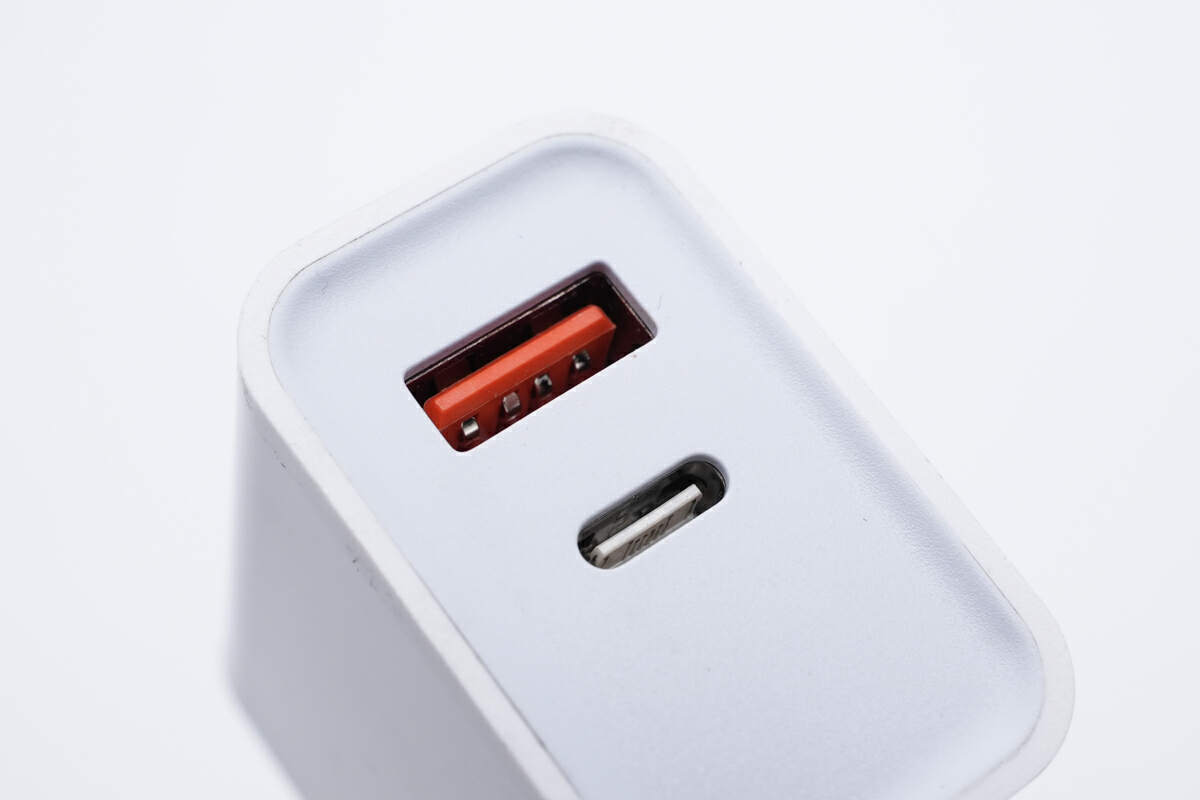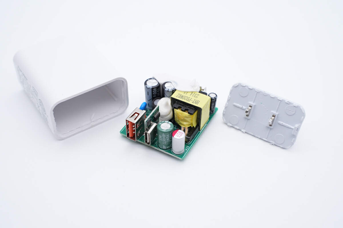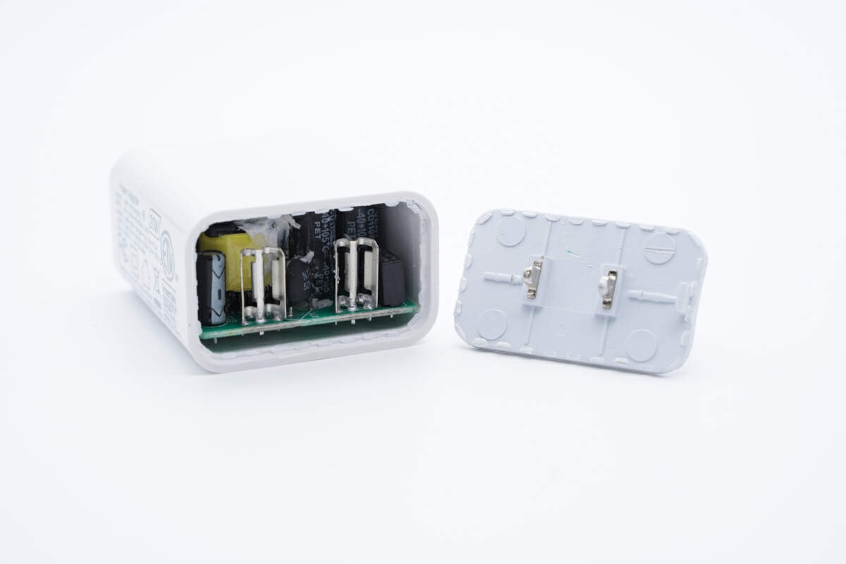 根据输出接口的不同,充电器分为1C1A双口与单USB-C接口两种配置,1C1A双口版本两个接口均支持快充,双口同时输出时为5V3A,下面就选取美规版本进行拆解,看看内部的用料和设计。