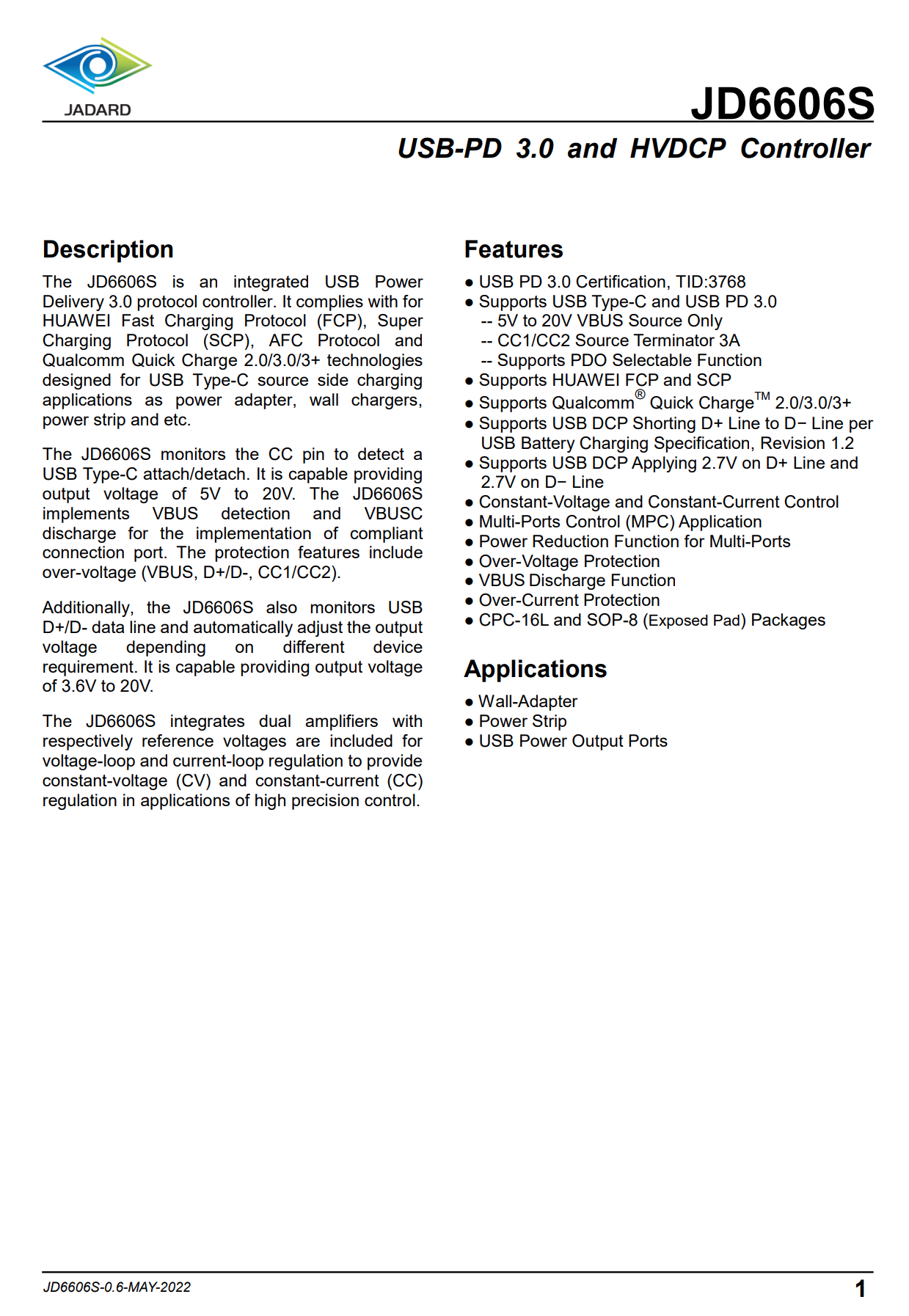 天德钰JD6606S提供恒压恒流控制,支持多口输出控制,支持输出过压,过流保护,并且集成VBUS放电功能,输出协议由电阻灵活配置,并且支持多口输出降功率,支持最大60W到最小18W输出,满足主流PD适配器输出。