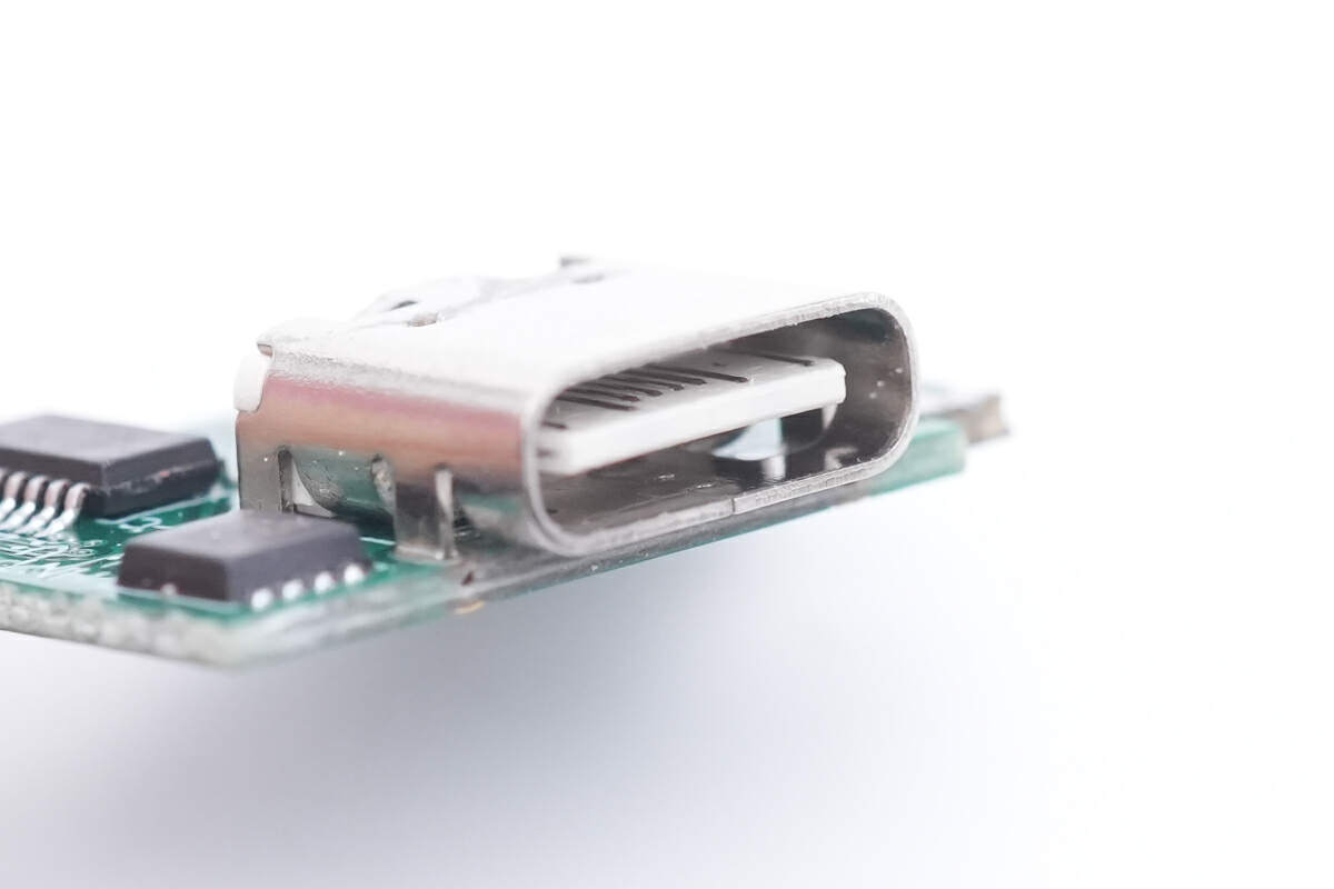 USB-C母座采用过孔焊接固定,白色胶芯不露铜。