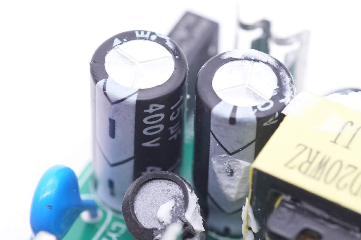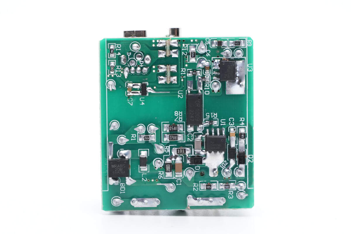 PCBA模块背面一览,左侧下方为输入整流桥,右侧焊接初级主控芯片,光耦,上方焊接同步整流芯片。