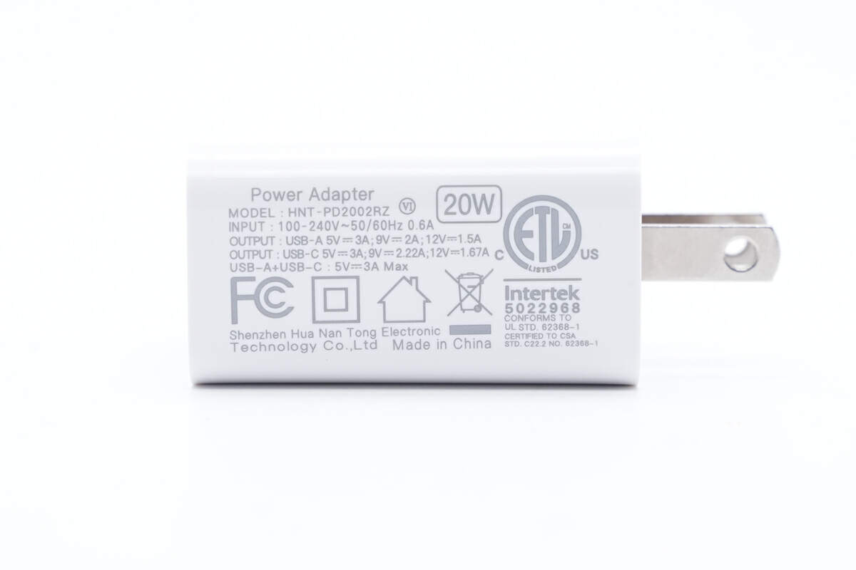 华湳通20W 1C1A充电器具有多种插脚可选,本次拆解的为固定美规插脚。充电器为经典的直板造型设计,USB-C口支持20W快充,USB-A口支持18W快充,实测快充协议支持相当全面,对于手机和传统设备的充电都有很好的兼容性。