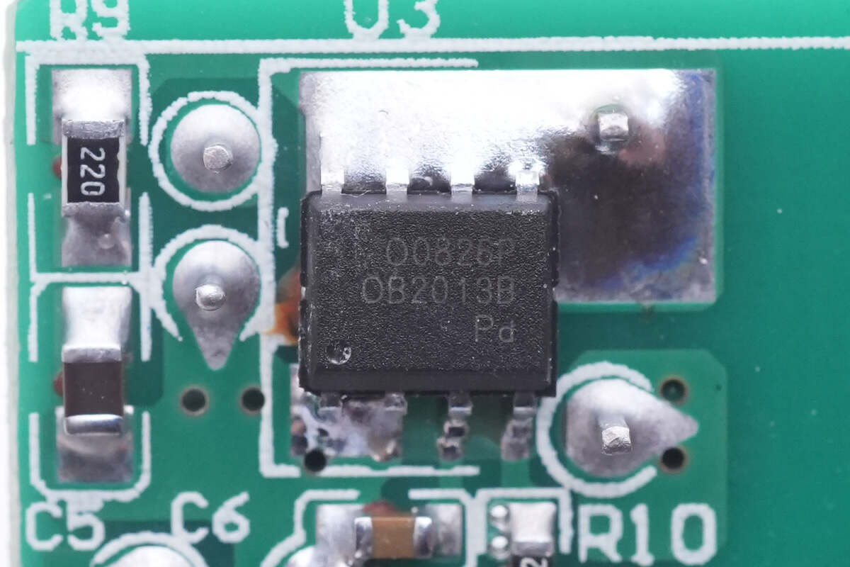同步整流芯片来自昂宝,型号OB2013B,内部集成同步整流控制器和同步整流管,支持最高12V输出。