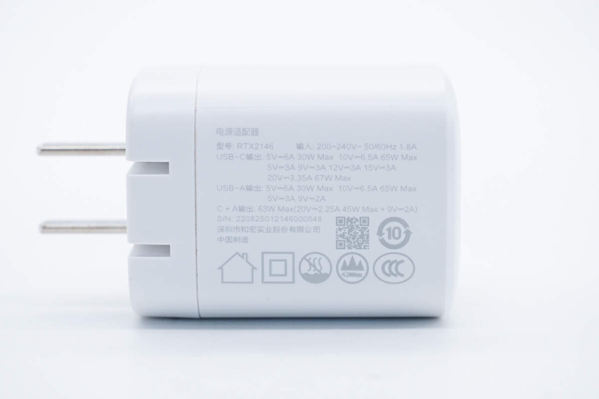 真我推出的这款67W氮化镓充电器采用白色机身,配合折叠插脚涉及,便携好用。充电器USB-C口支持67W PD快充和PPS快充,USB-A口支持OPPO私有65W快充,两个接口均可满足OPPO手机快充,同时USB-C接口支持对笔记本电脑充电,兼容性还是不错的。