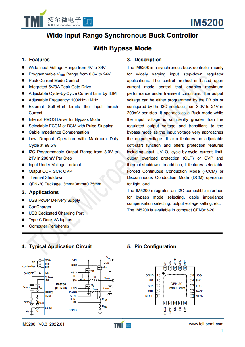 小板背面焊接同步降压转换器,来自拓尔微,型号IM5200,是一款同步高效buck控制器,主要用于宽输入的buck应用。其控制方式为峰值电流控制模式,可在瞬态条件下实现最优性能。输出电压支持电阻分压设置和I2C配置,芯片支持多种保护功能。