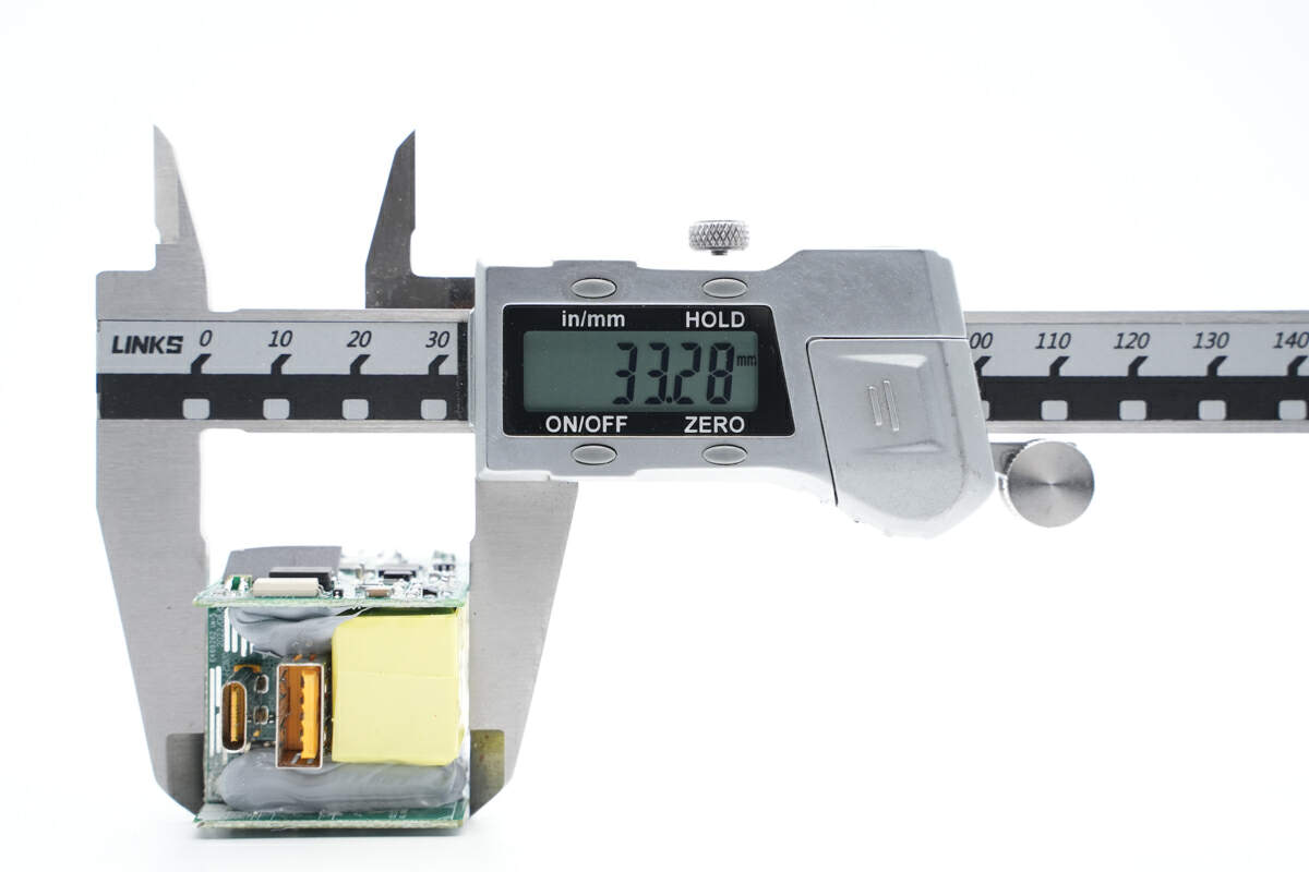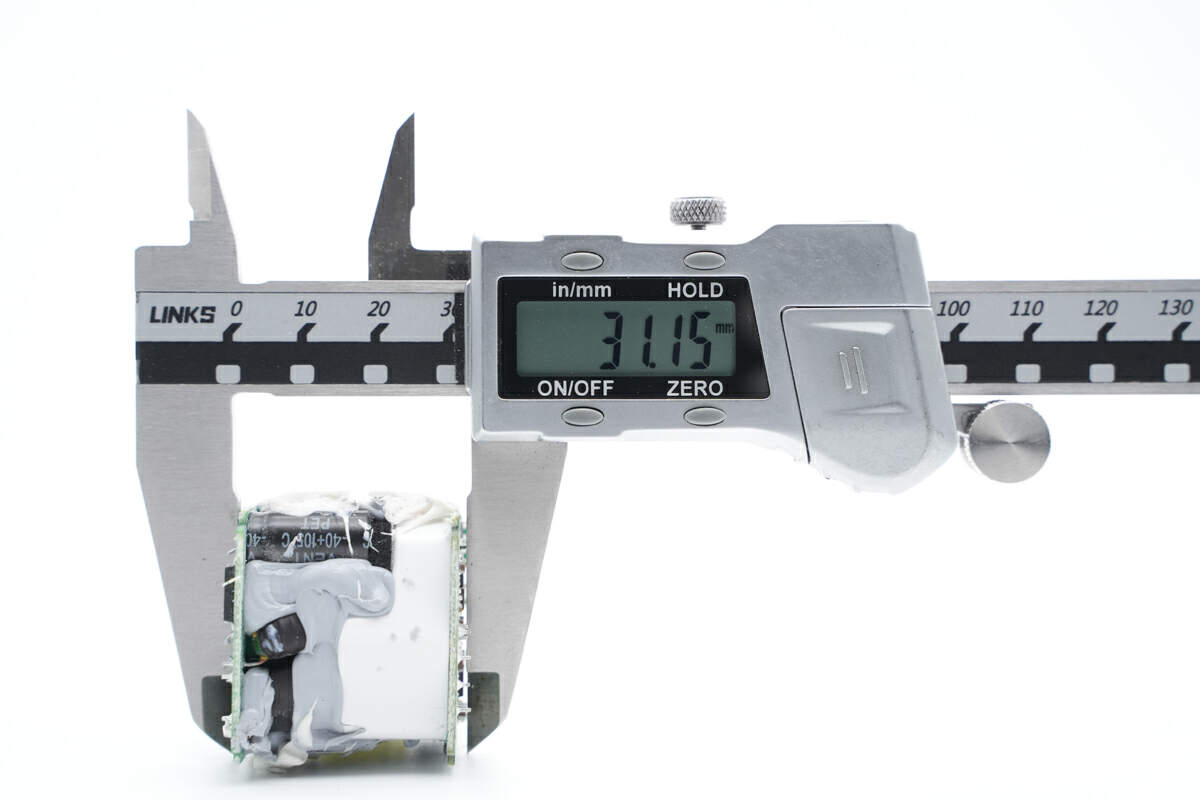 使用游标卡尺测得PCBA模块长度约为39.03mm。