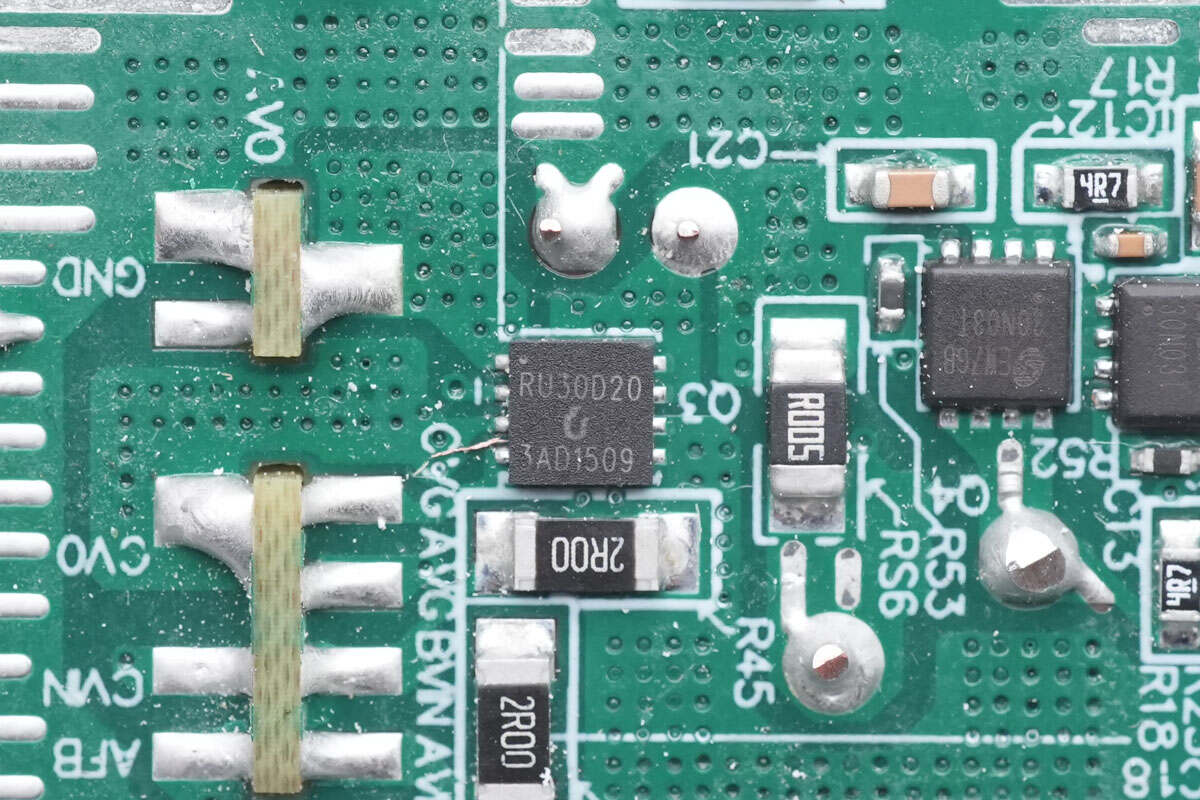 输出VBUS开关管来自锐骏半导体,型号RU30D20,是一颗双NMOS,耐压30V,导阻8.5mΩ,使用PDFN3333封装。
