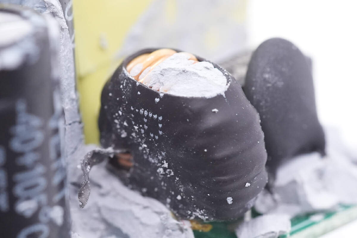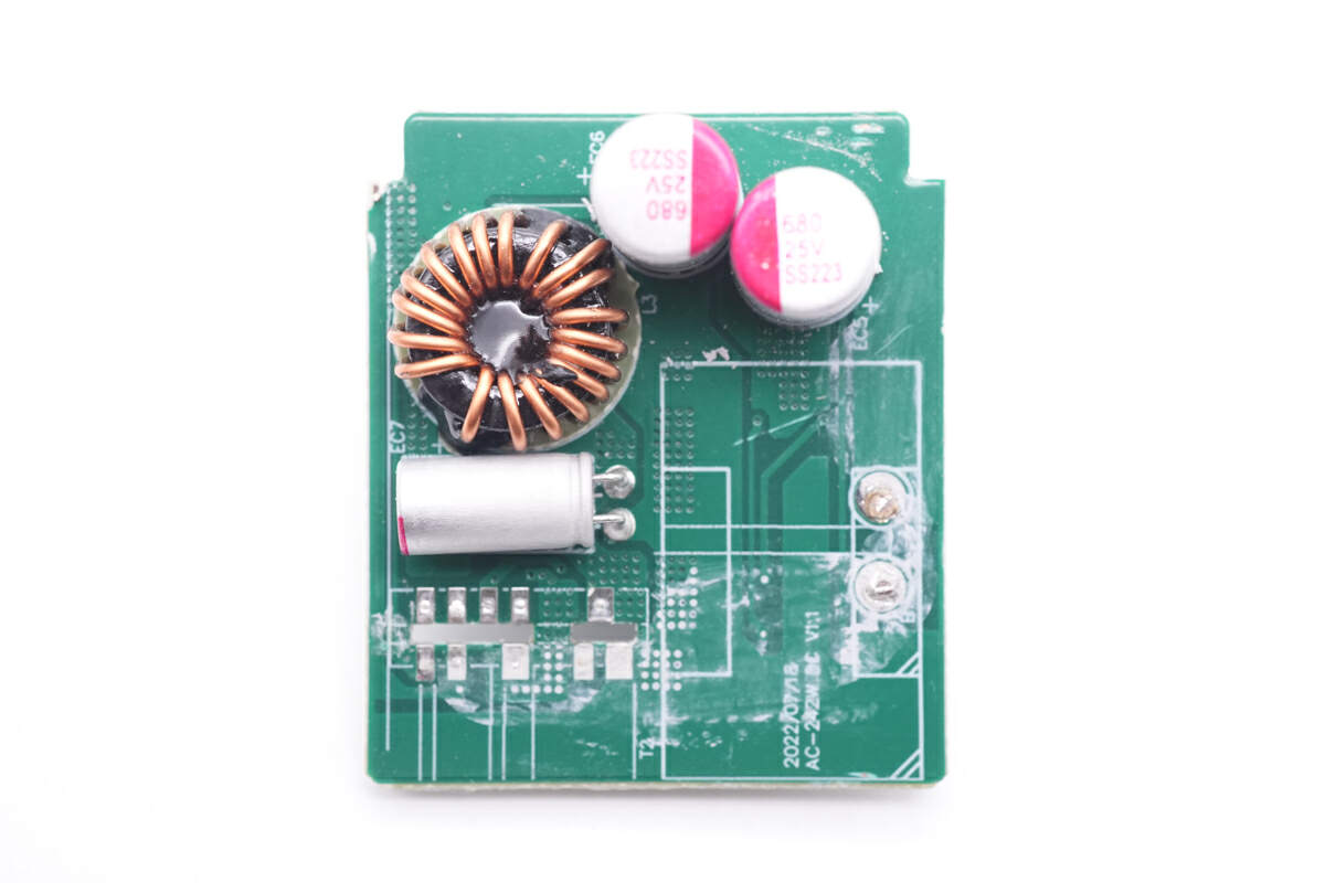 高压侧小板正面一览,焊接NTC热敏电阻,保险丝,共模电感,高压滤波电容和变压器等。