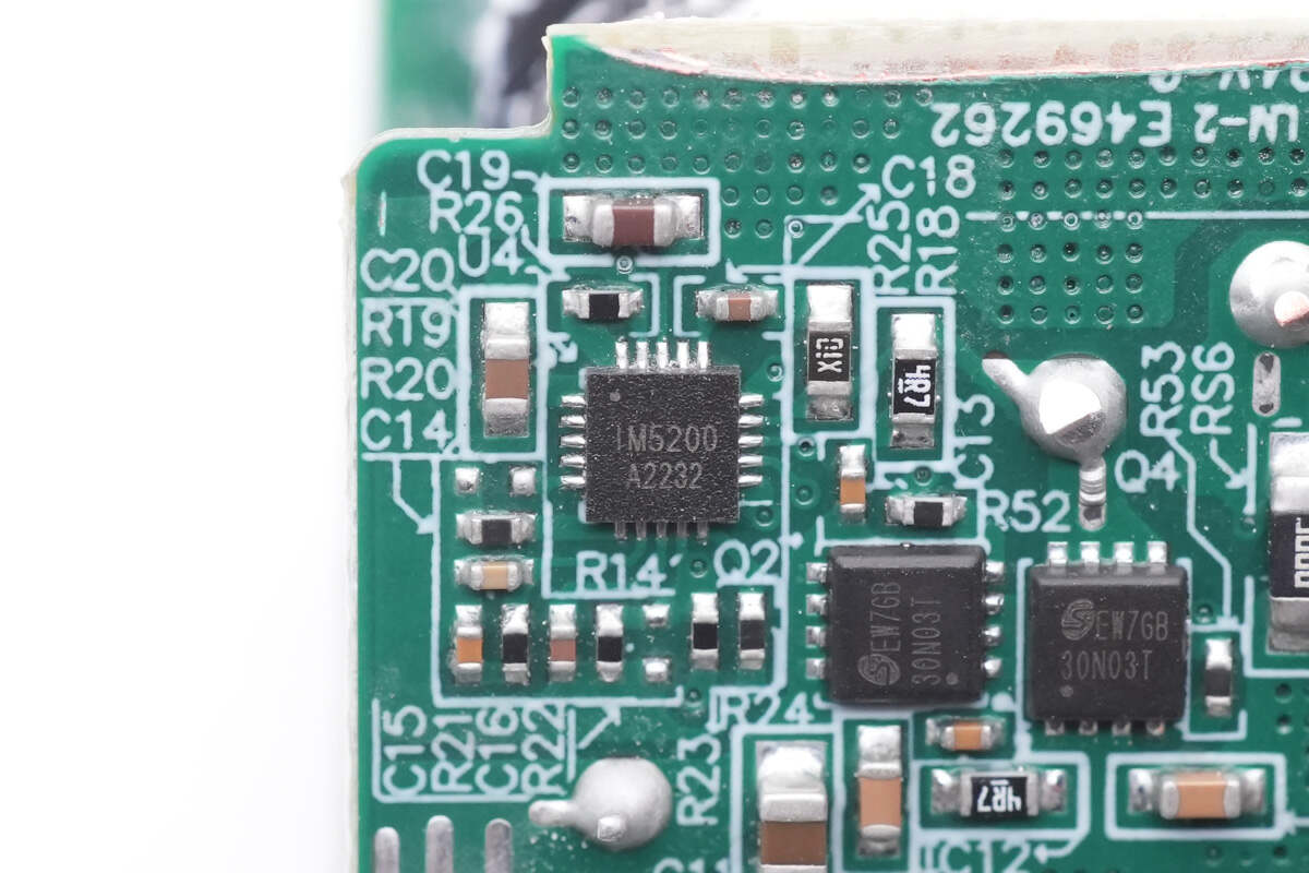 充电头网通过拆解了解到,这款充电器内部采用三块PCB组合焊接,整流桥与氮化镓开关管分散布置,降低温升。内部采用茂睿芯MK2697氮化镓主控芯片搭配英诺赛科INN650DA260A氮化镓开关管,输出采用英集芯IP2738双口协议芯片搭配拓尔微IM5200同步降压控制器,实现双口快充。
