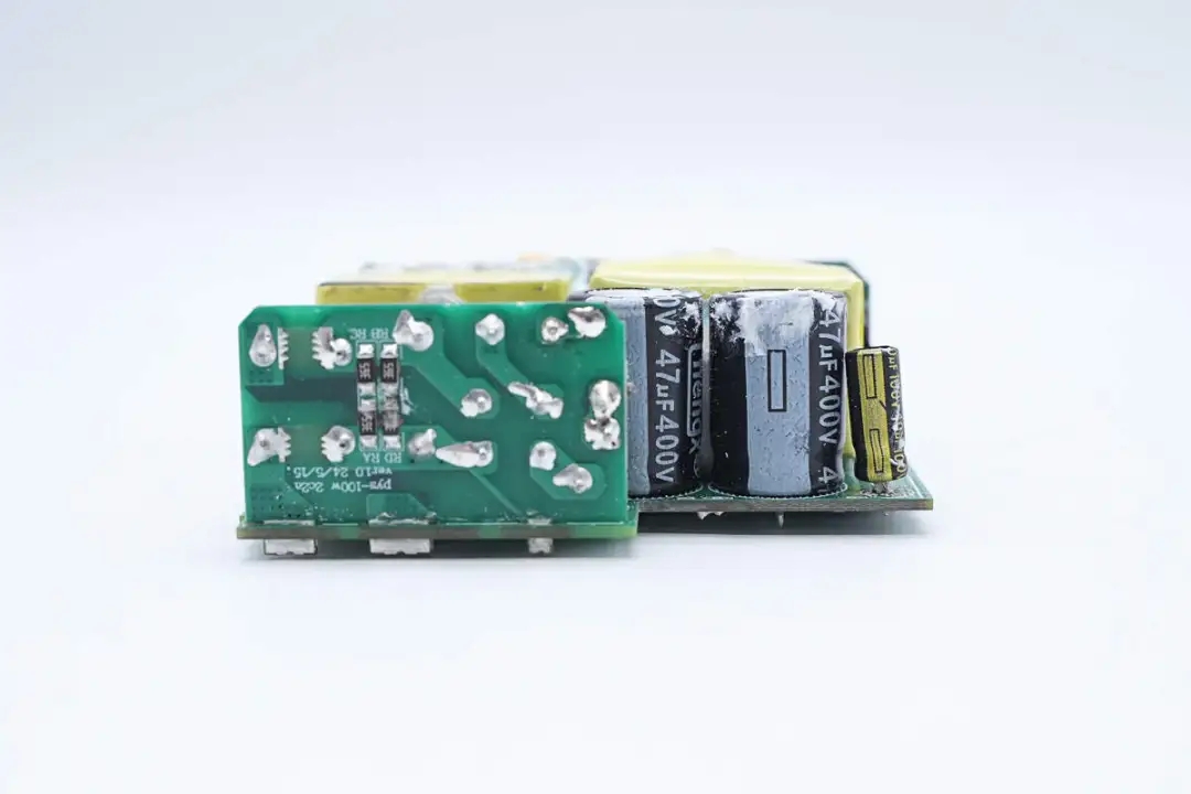 输出端垂直焊接一块小板,主板上设有同步整流输出滤波固态电容以及滤波电感。