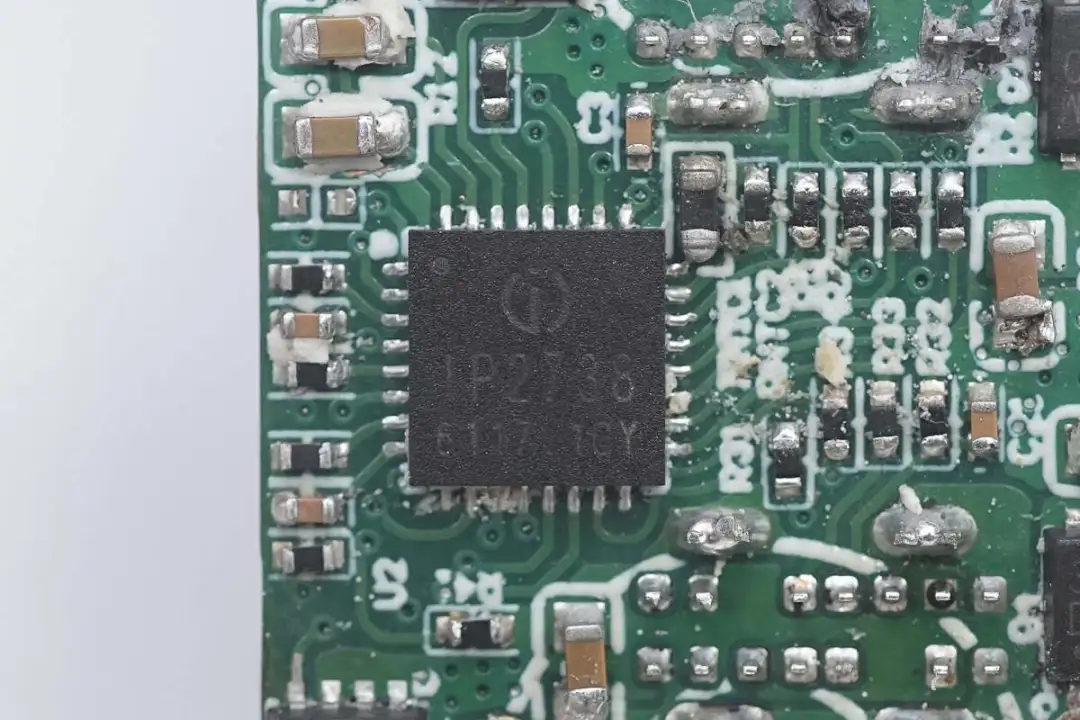 两个USB-C接口的协议芯片来自英集芯,型号IP2738,是一颗双路协议芯片,支持双口18-140W快充应用,具备独立的反馈控制,具备独立的USB PD控制,相当于两颗IP2736整合到一颗芯片内部,快充规格与IP2736相同。支持USB PD3.1 28V EPR档位,并支持PD3.0/PPS等丰富全面的快充协议,兼容性非常好。
