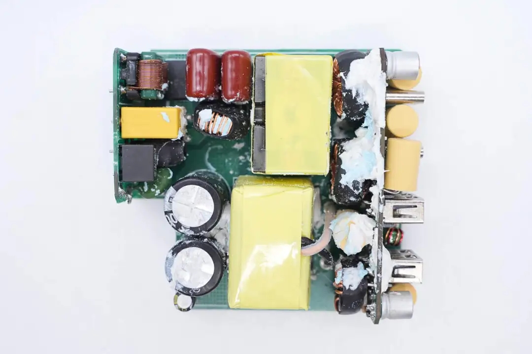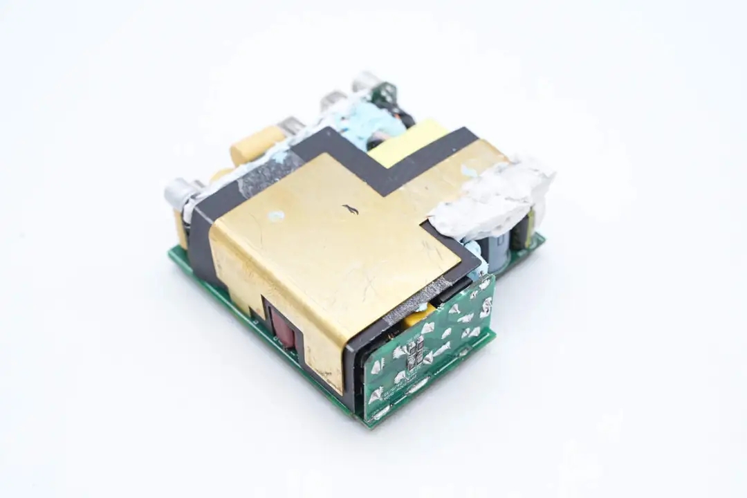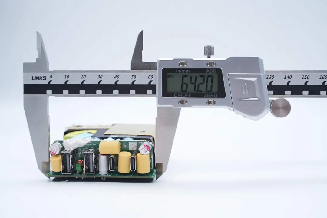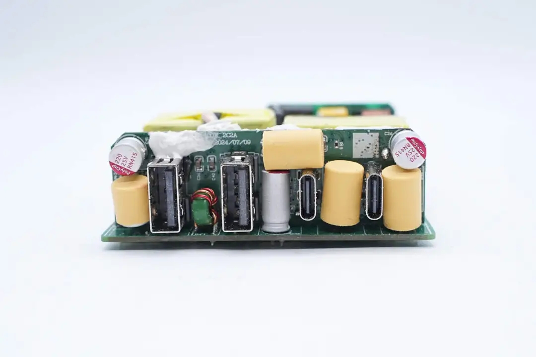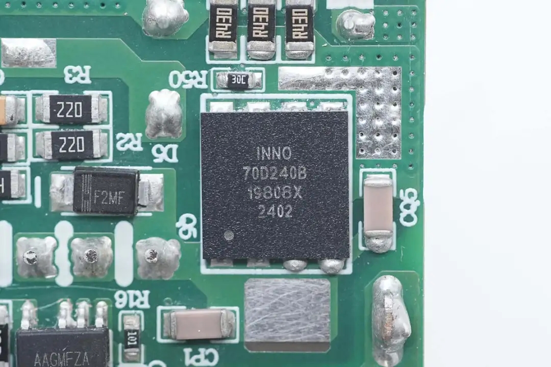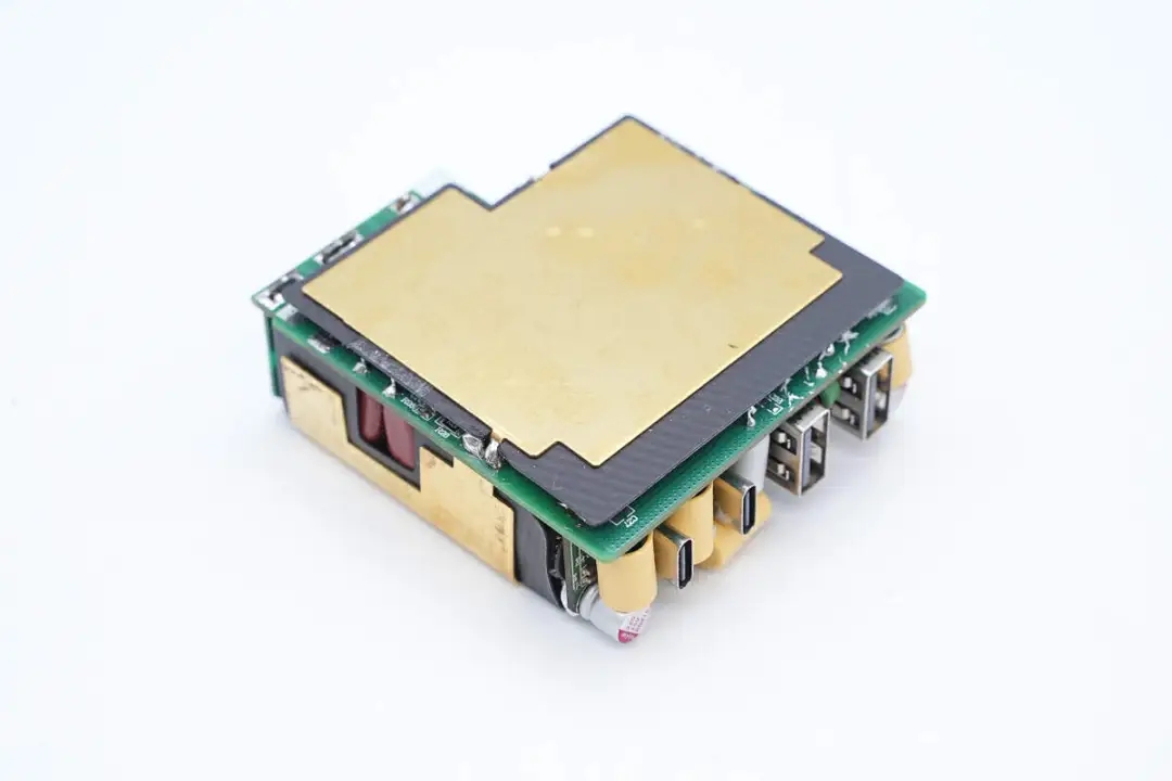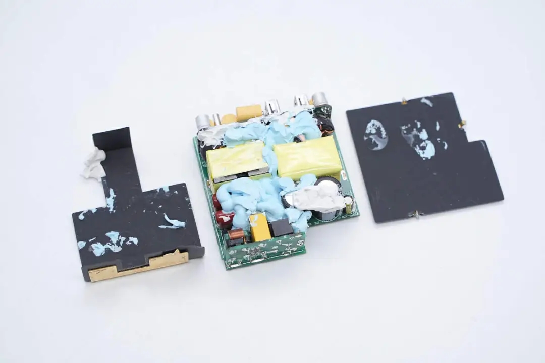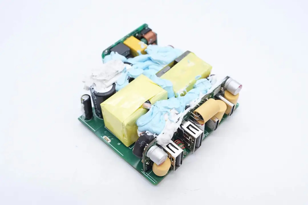 三路二次降压电路同步降压控制器均使用的英集芯IP6550,并使用英集芯IP2738和IP2726两颗协议芯片分别控制四个接口输出。采用承兴电解电容以及柏瑞凯固态电容进行滤波,PCBA模块填充导热胶以及覆盖散热片帮助散热,此外绝缘设计做的也很到位。