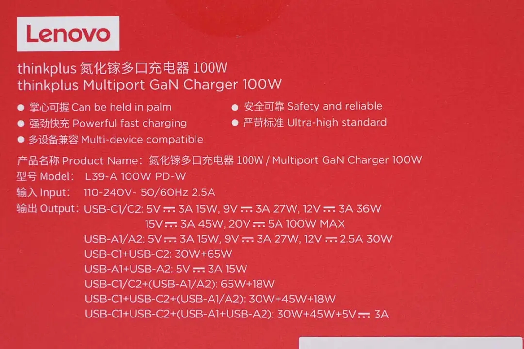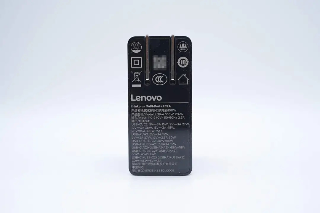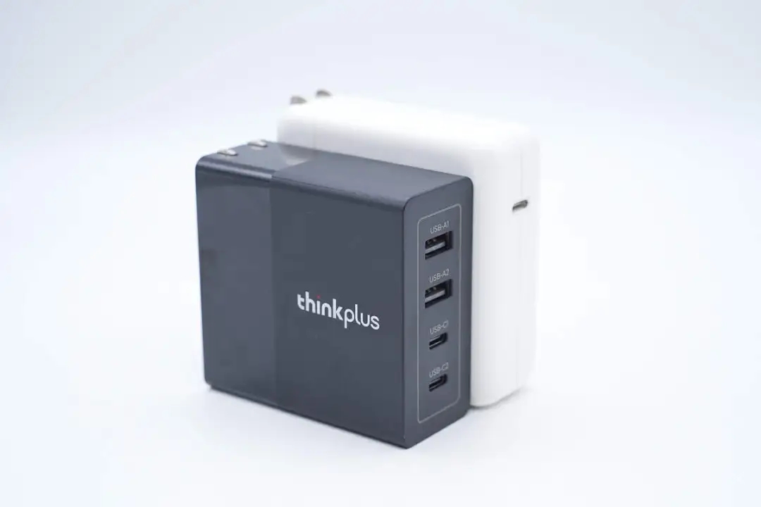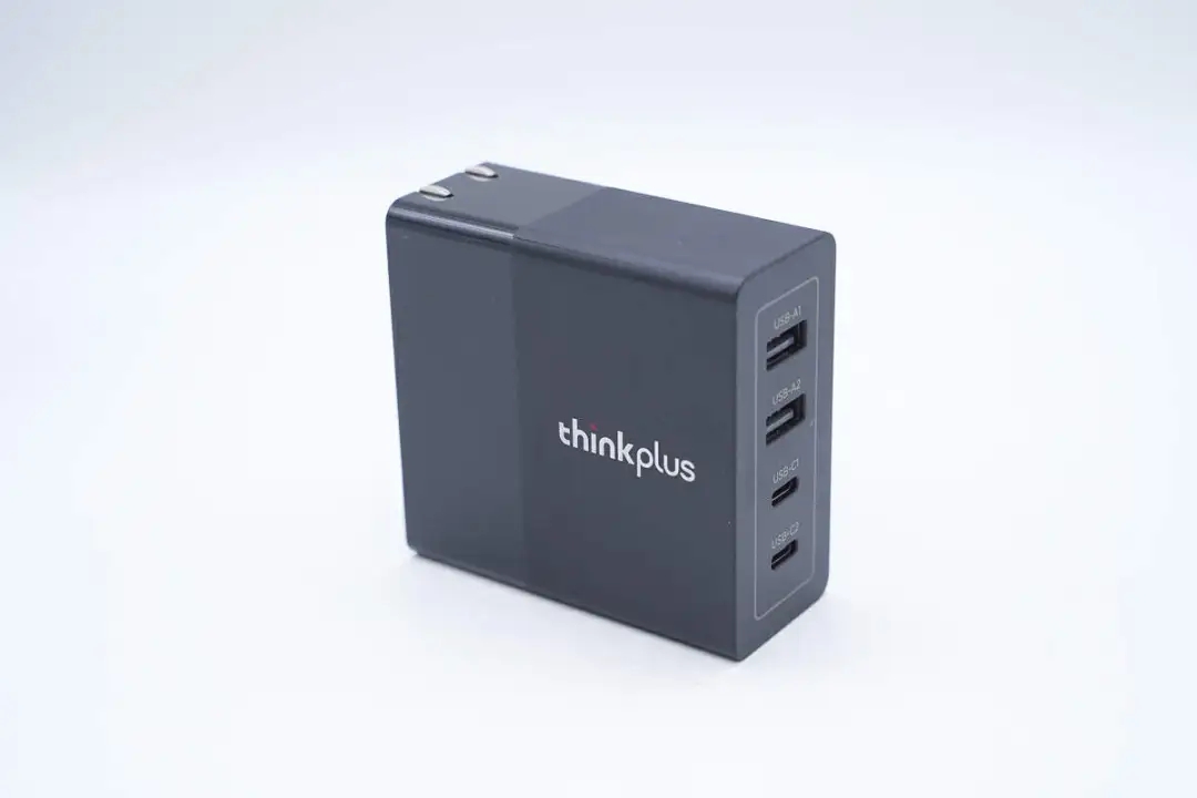 thinkplus 100W氮化镓多口充电器延续亮面磨砂撞色设计语言,配置2A2C四个USB接口以及可折叠插脚,兼容QC、PD、PPS、SCP等快充,同时最大支持100W快充,是一款兼顾了多接口、兼容性、性能以及便携性的不错产品,满足笔电、平板、手机等设备居家和出行快充需求。