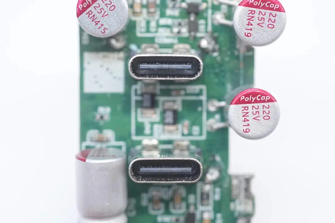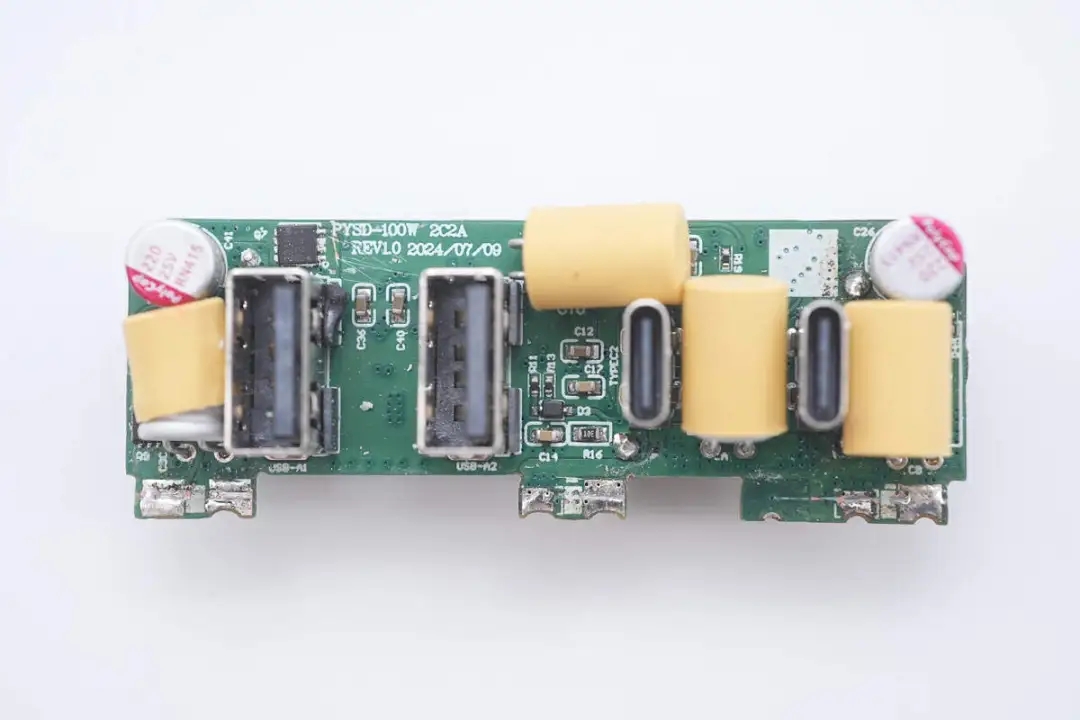 将小板拆下,正面设有多颗滤波固态电容以及USB-A1口输出VBUS开关管,其中四颗滤波固态电容还套有胶套保护。