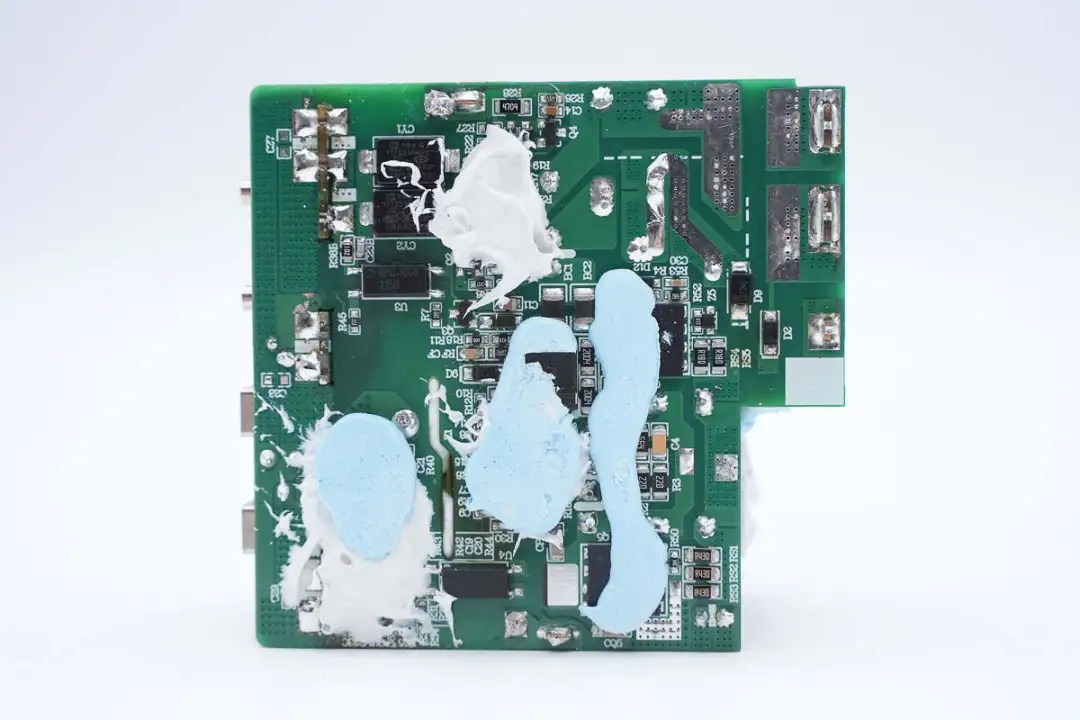 PCBA模块正面器件间的缝隙填充蓝、白胶帮助导热和加固,设计合理。