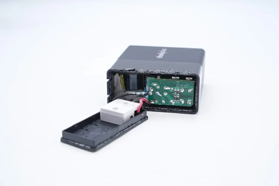 将充电器输入端外壳拆开,插脚采用白色塑料板以及螺丝固定,通过导线连接PCBA模块通电。