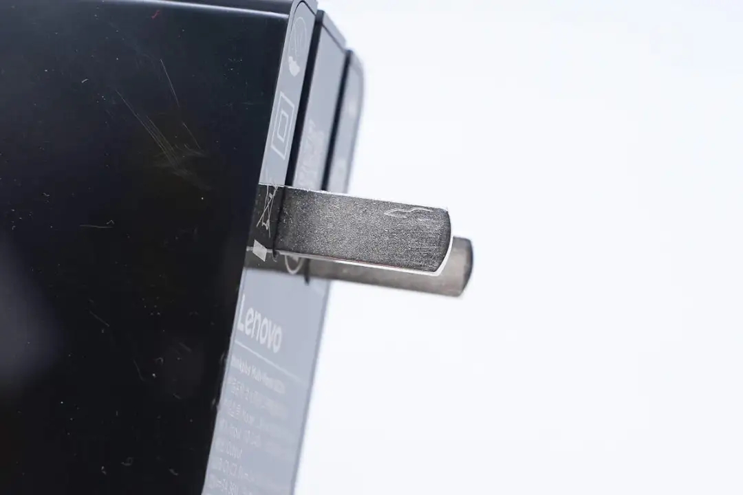 和苹果96W充电器放在一起对比,联想这款的体积要更小一些。