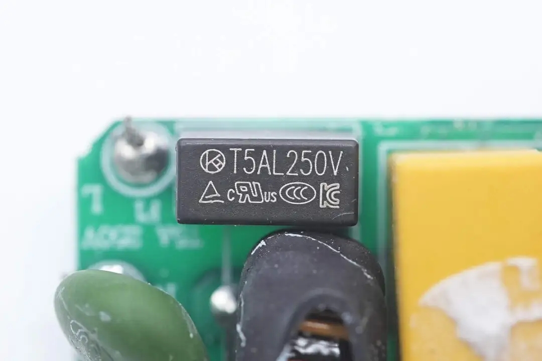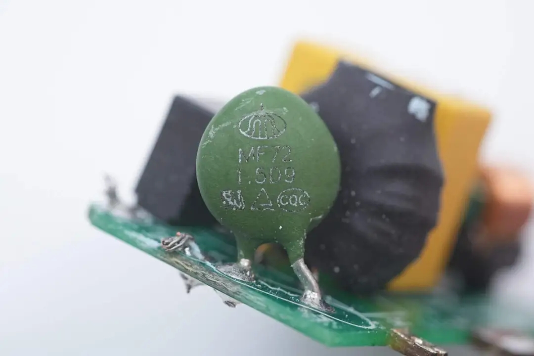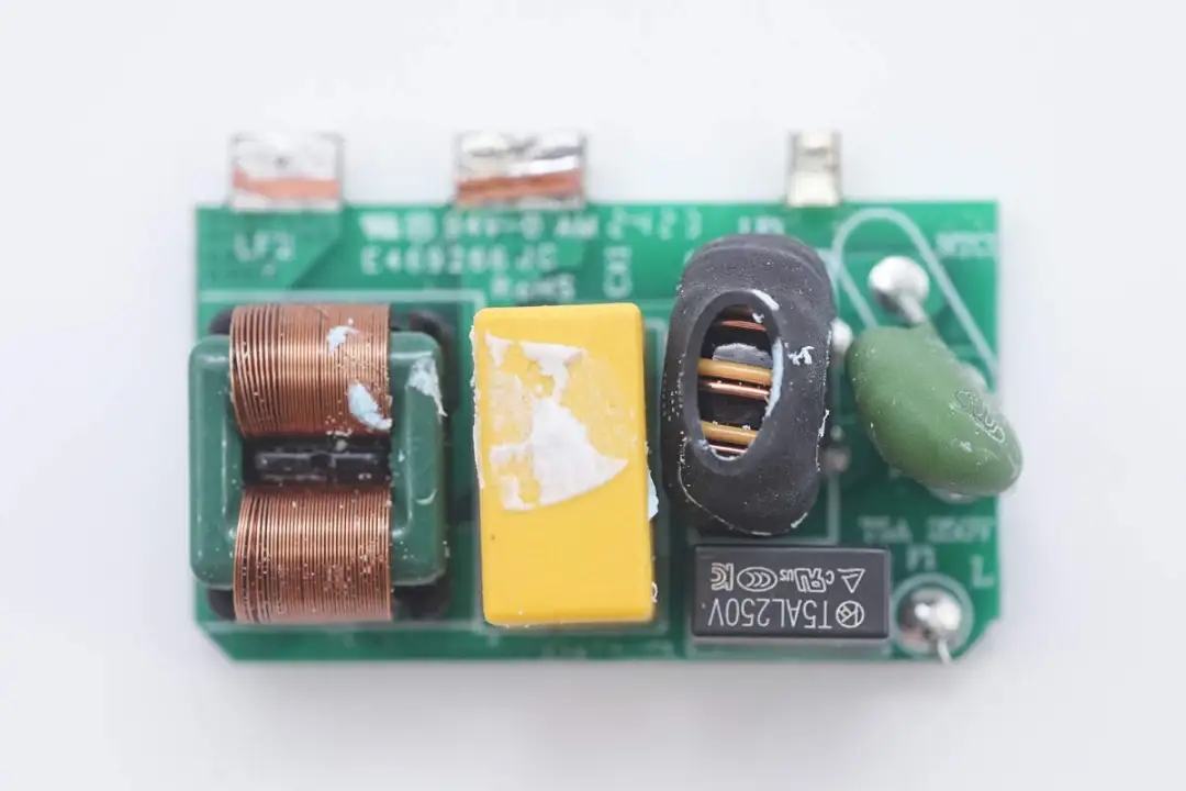 将小板拆下,板子正面设有延时保险丝、NTC热敏电阻、安规X2电容以及两级共模电感。