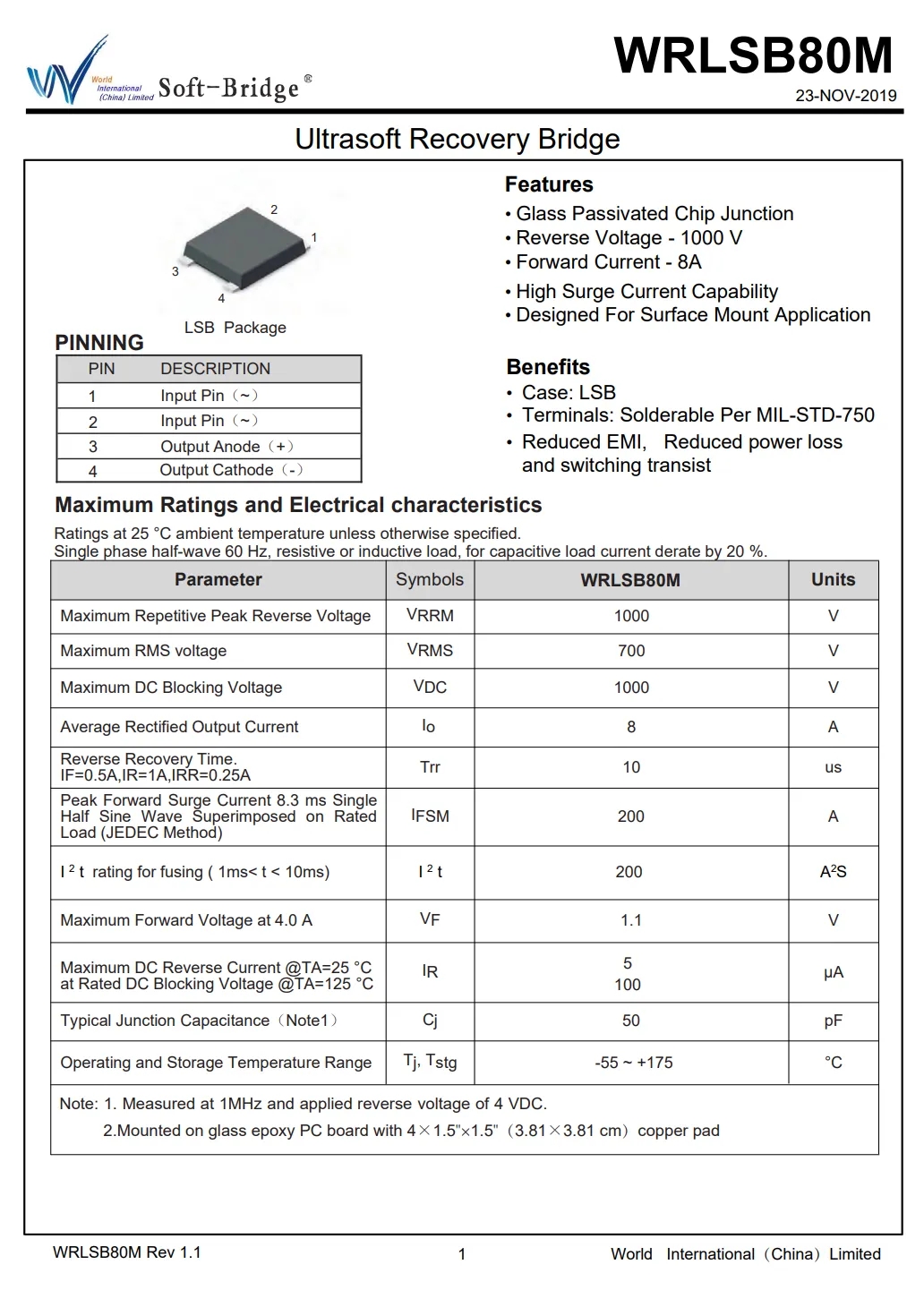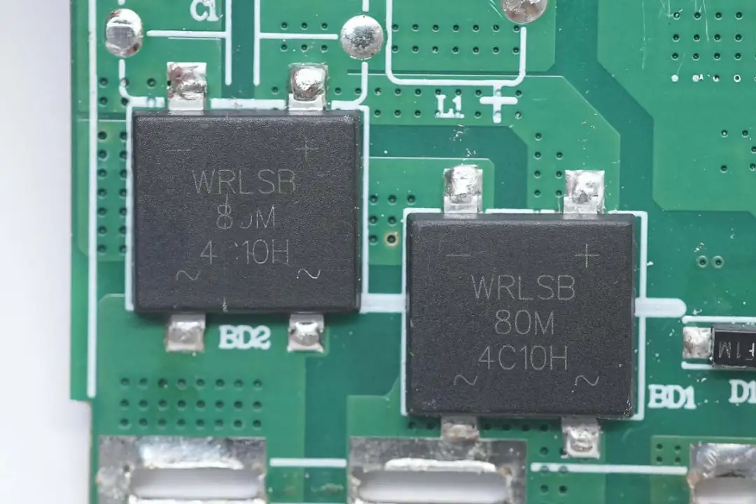整流桥来自深圳市沃尔德实业有限公司,型号WRLSB80M,这颗软桥通过较软的恢复曲线,比较平滑的关断特性,可以降低二极管结电容达到非常少的谐波振荡产生的效果。选用的LSB封装,拥有良好的散热特性,帮助中大瓦数适配器提升可靠性,单颗可做60W+。