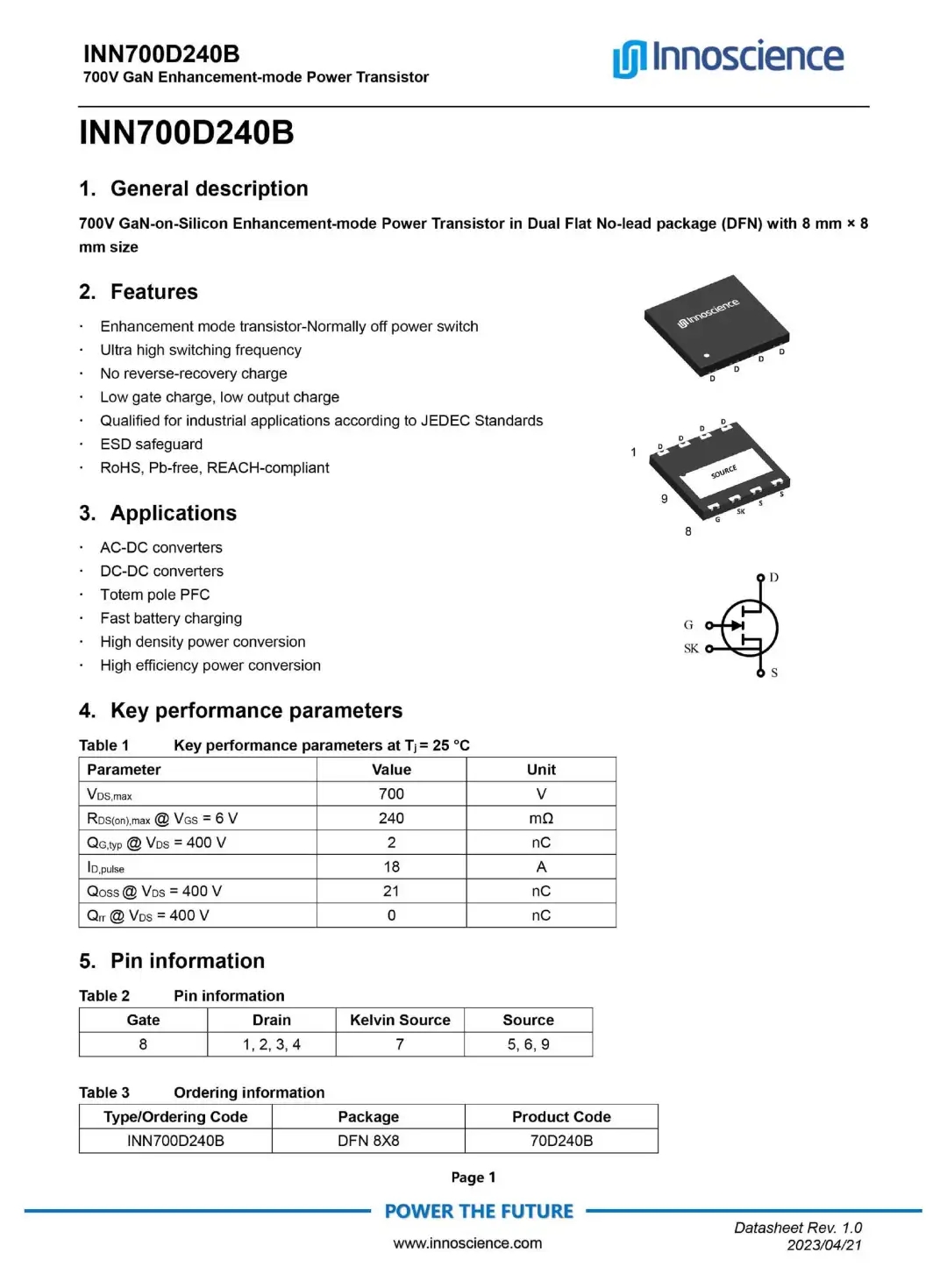 PFC升压开关管采用英诺赛科INN700D240B,是一颗耐压700V的增强型氮化镓开关管,瞬态耐压为800V,导阻为240mΩ,符合JEDEC标准的工业应用需求,内置ESD保护,采用DFN8*8封装。