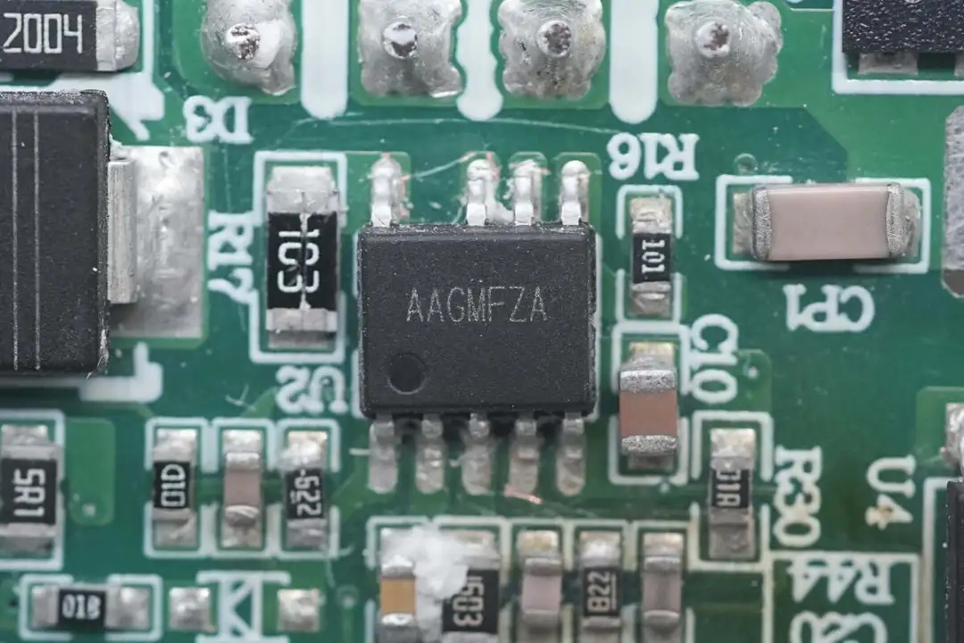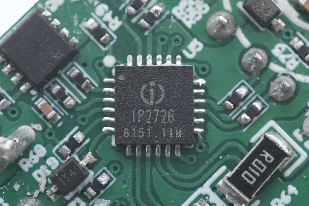 两个USB-A口协议芯片来自英集芯,型号为IP2726,是一颗应用非常广泛的协议芯片。英集芯IP2726是一颗集成多种协议、用于USB输出端口的快充IC,支持Type-C DFP、PD2.0/3.0、PPS、QC4+、QC2.0/3.0、FCP、AFC、SCP、MTK PE+、Apple2.4A、BC1.2以及三星2A等协议。具有高集成度和丰富的功能,在应用时仅需极少的外围器件,有效减小整体方案的尺寸,降低BOM成本。