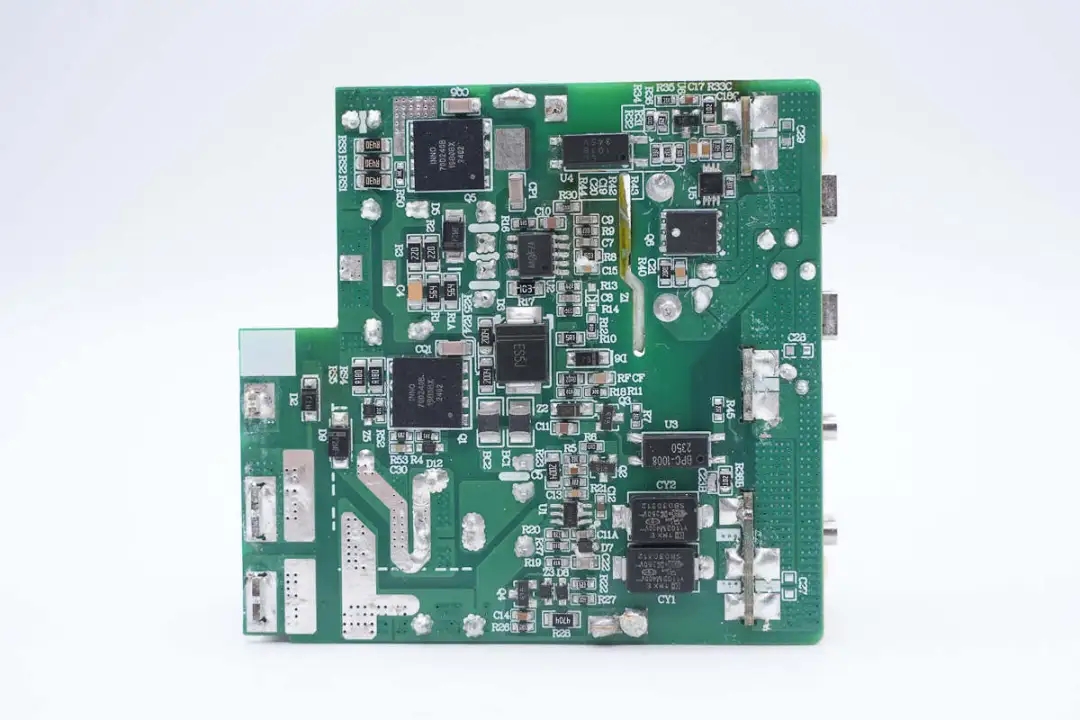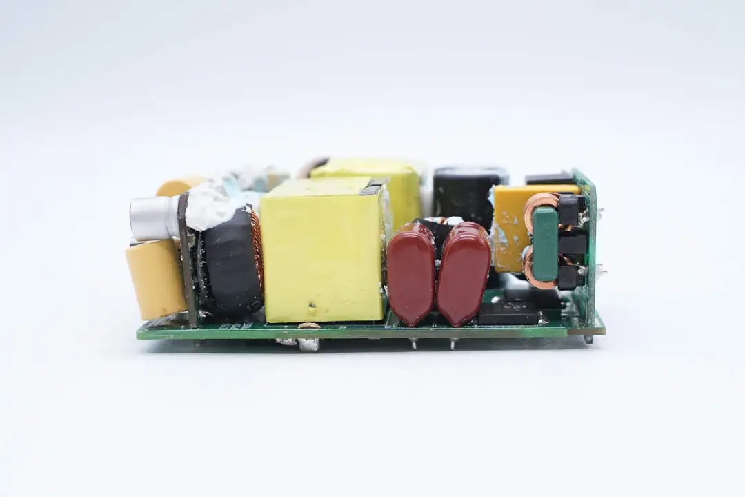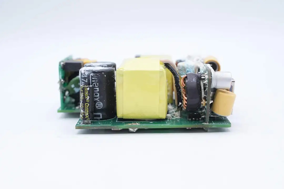 主板另一侧设有高压滤波电解电容、主控芯片供电电容、变压器以及输出滤波固态电容。