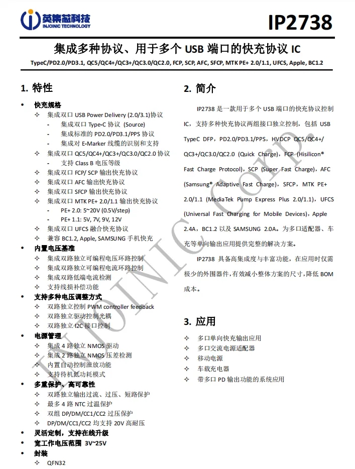 英集芯IP2738内置四路独立的NMOS驱动,可用于多个接口输出控制,控制多个VBUS开关管进行输出端口切换以及两路电源并联控制,并且支持双路独立的过流、过压以及短路保护,确保使用安全。