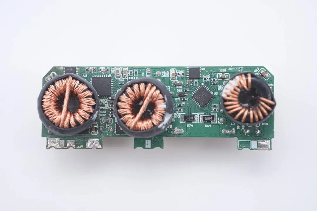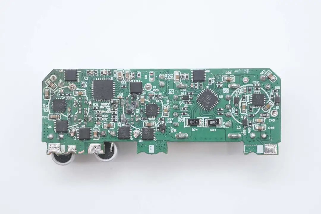 将三颗降压电感拆掉,板子上设有三路降压电路的同步降压控制器、同步降压开关管、两颗协议芯片以及输出VBUS开关管。
