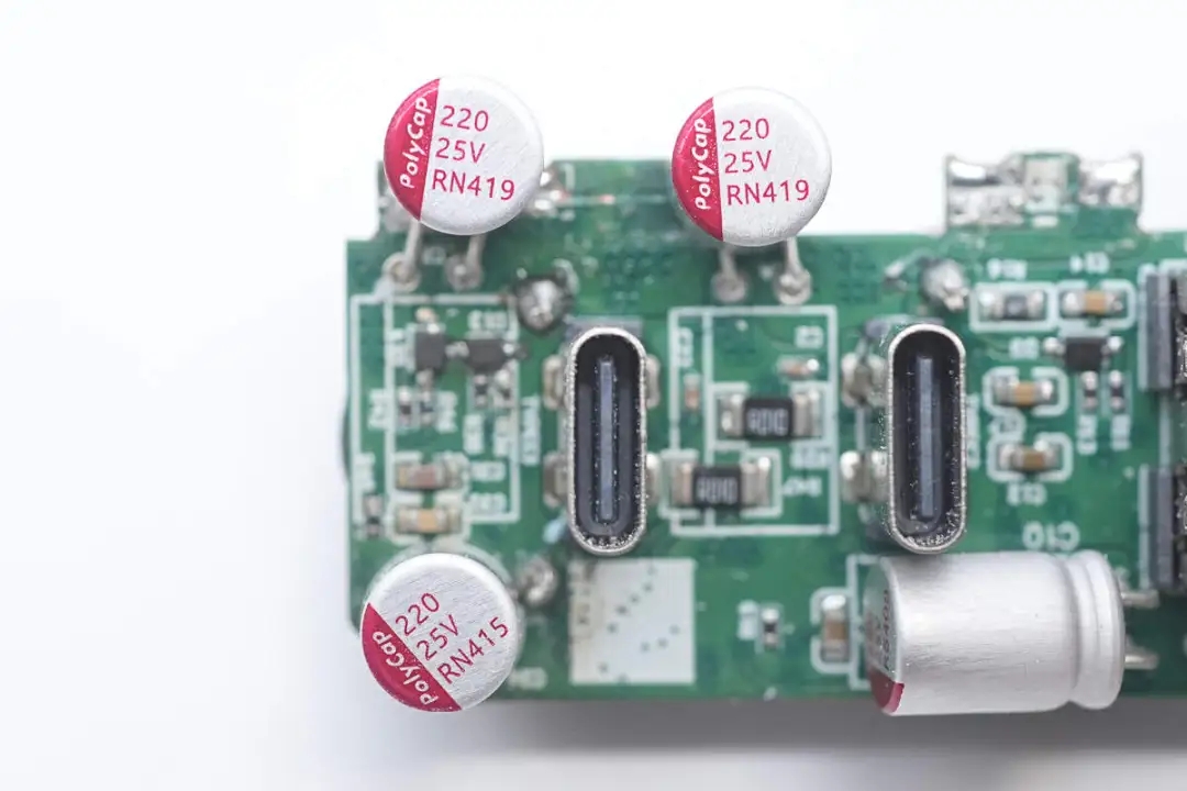 三颗滤波固态电容来自柏瑞凯,规格均为25V220μF,用于降压输出和接口输出滤波。