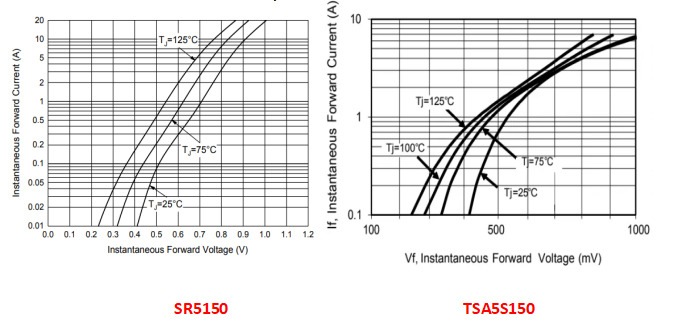 上图的曲线和数据显示,采用Trench工艺的肖特基二极管在相同电流的情况下比采用STD工艺的肖特基二极管的VF值要低,具有更精细的小电流、高开关速度和良好的线性特性。